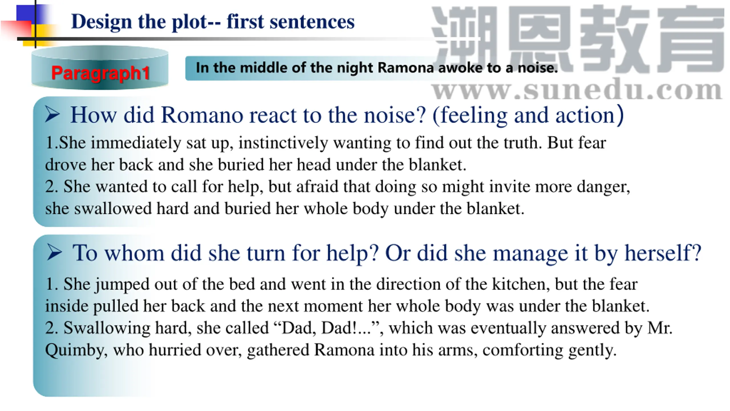 Design the plot-- first sentences In the middle of the night Ramona awoke to a noise. Paragraph1 How did Romano react to the noise? (feeling and action 1.She immediately sat up, instinctively wanting to find out the truth. But fear drove her back and she buried her head under the blanket. 2. She wanted to call for help, but afraid that doing so might invite more danger, she swallowed hard and buried her whole body under the blanket. To whom did she turn for help? Or did she manage it by herself? 1. She jumped out of the bed and went in the direction of the kitchen, but the fear inside pulled her back and the next moment her whole body was under the blanket. 2. Swallowing hard, she called Dad, Dad!... , which was eventually answered by Mr. Quimby, who hurried over, gathered Ramona into his arms, comforting gently.