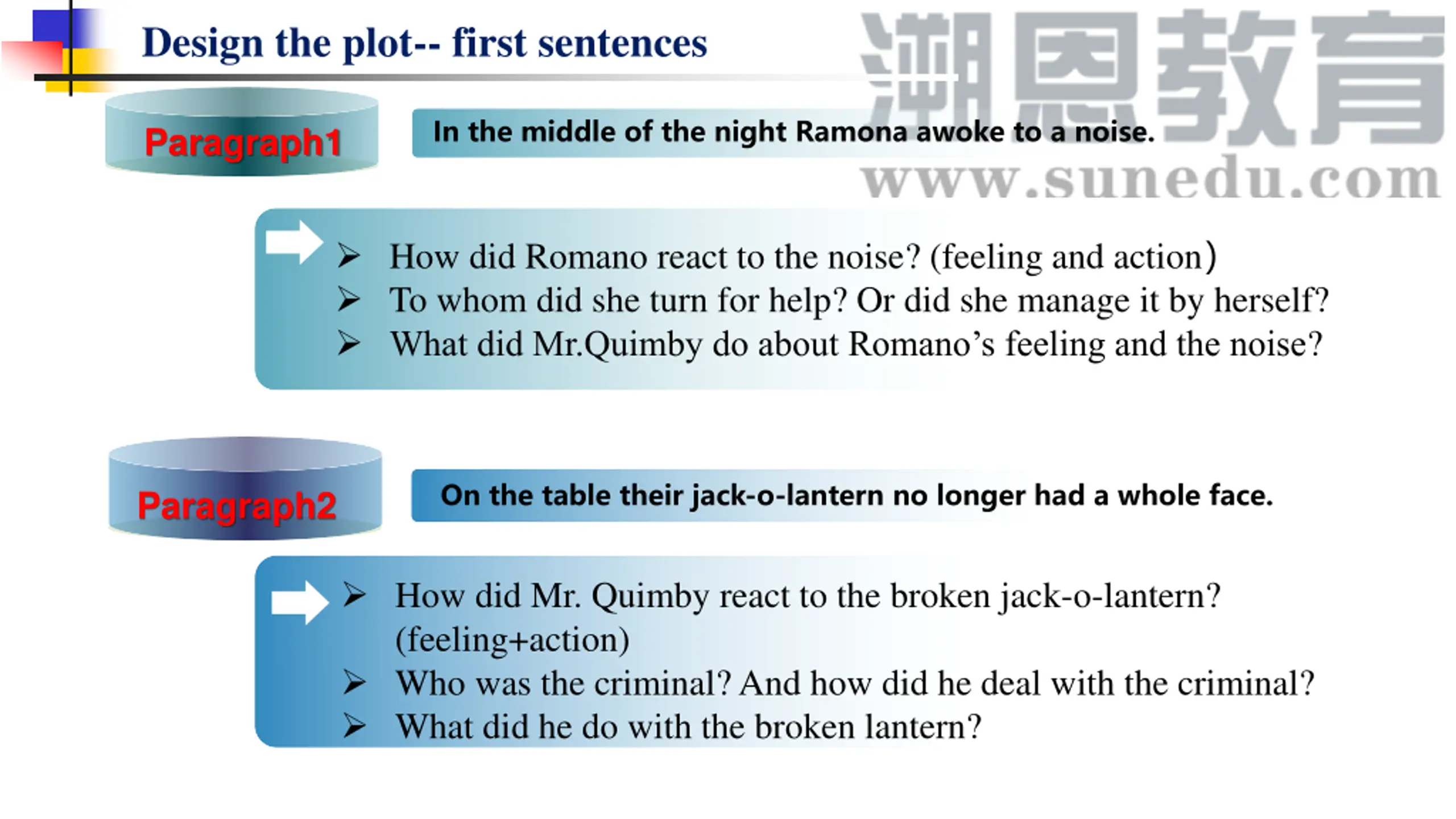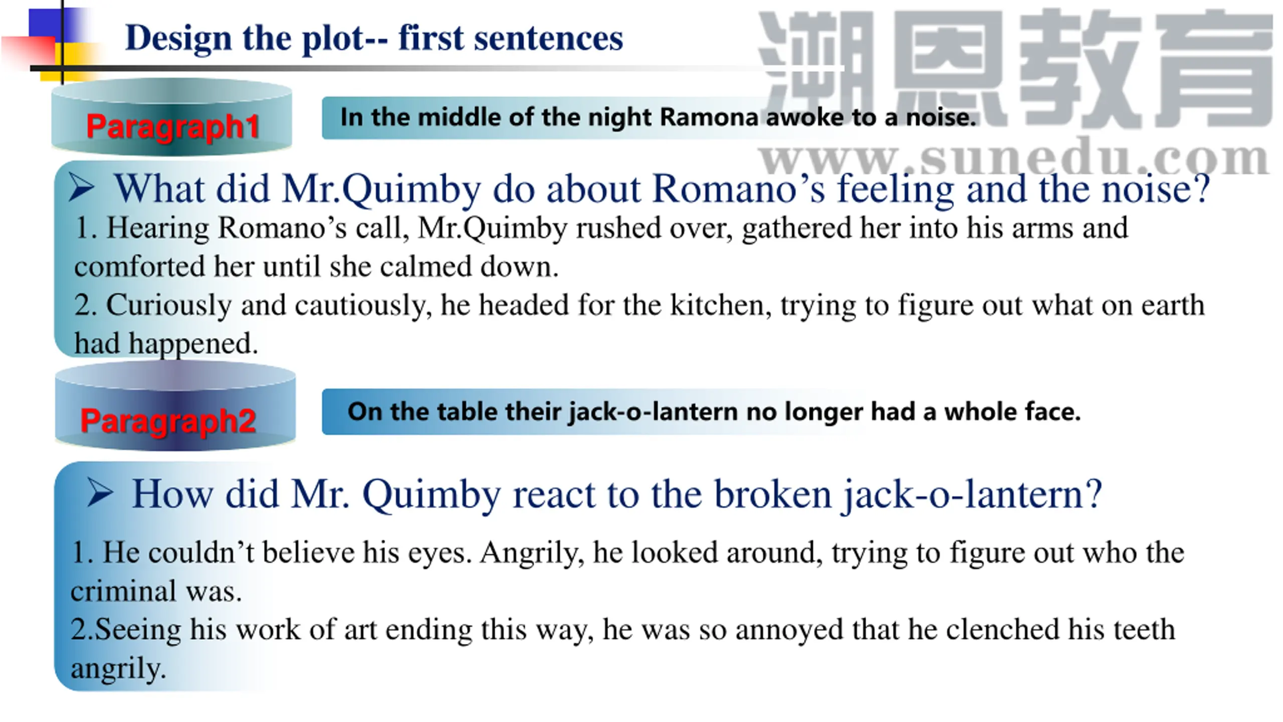Design the plot-- first sentences In the middle of the night Ramona awoke to a noise. Paragraph1 What did Mr.Quimby do about Romano s feeling and the noise? 1. Hearing Romano s call, Mr.Quimby rushed over, gathered her into his arms and comforted her until she calmed down. 2. Curiously and cautiously, he headed for the kitchen, trying to figure out what on earth had happened. On the table their jack-o-lantern no longer had a whole face. Paragraph2 How did Mr. Quimby react to the broken jack-o-lantern? 1. He couldn t believe his eyes. Angrily, he looked around, trying to figure out who the criminal was. 2.Seeing his work of art ending this way, he was so annoyed that he clenched his teeth angrily.