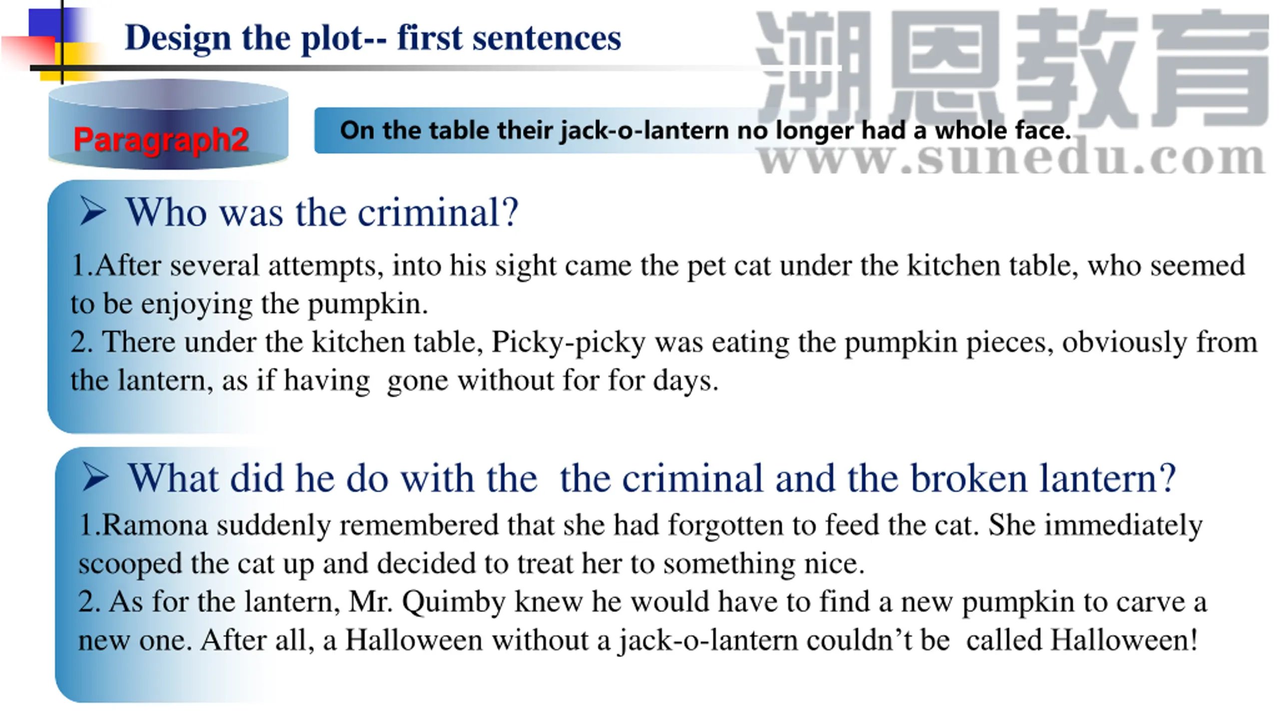 Design the plot-- first sentences On the table their jack-o-lantern no longer had a whole face. Paragraph2 Who was the criminal? 1.After several attempts, into his sight came the pet cat under the kitchen table, who seemed to be enjoying the pumpkin. 2. There under the kitchen table, Picky-picky was eating the pumpkin pieces, obviously from the lantern, as if having gone without for for days. What did he do with the the criminal and the broken lantern? 1.Ramona suddenly remembered that she had forgotten to feed the cat. She immediately scooped the cat up and decided to treat her to something nice. 2. As for the lantern, Mr. Quimby knew he would have to find a new pumpkin to carve a new one. After all, a Halloween without a jack-o-lantern couldn t be called Halloween!