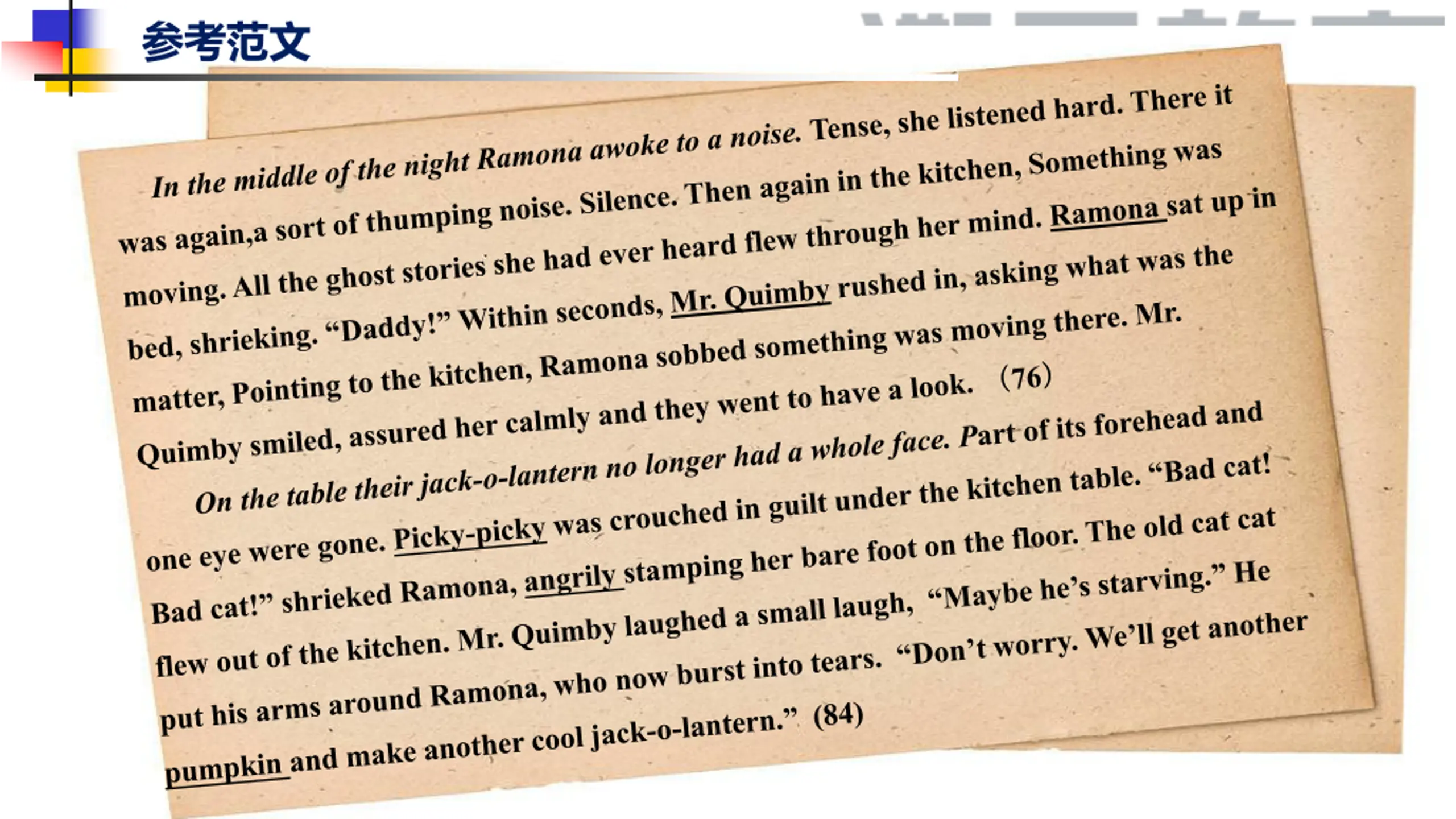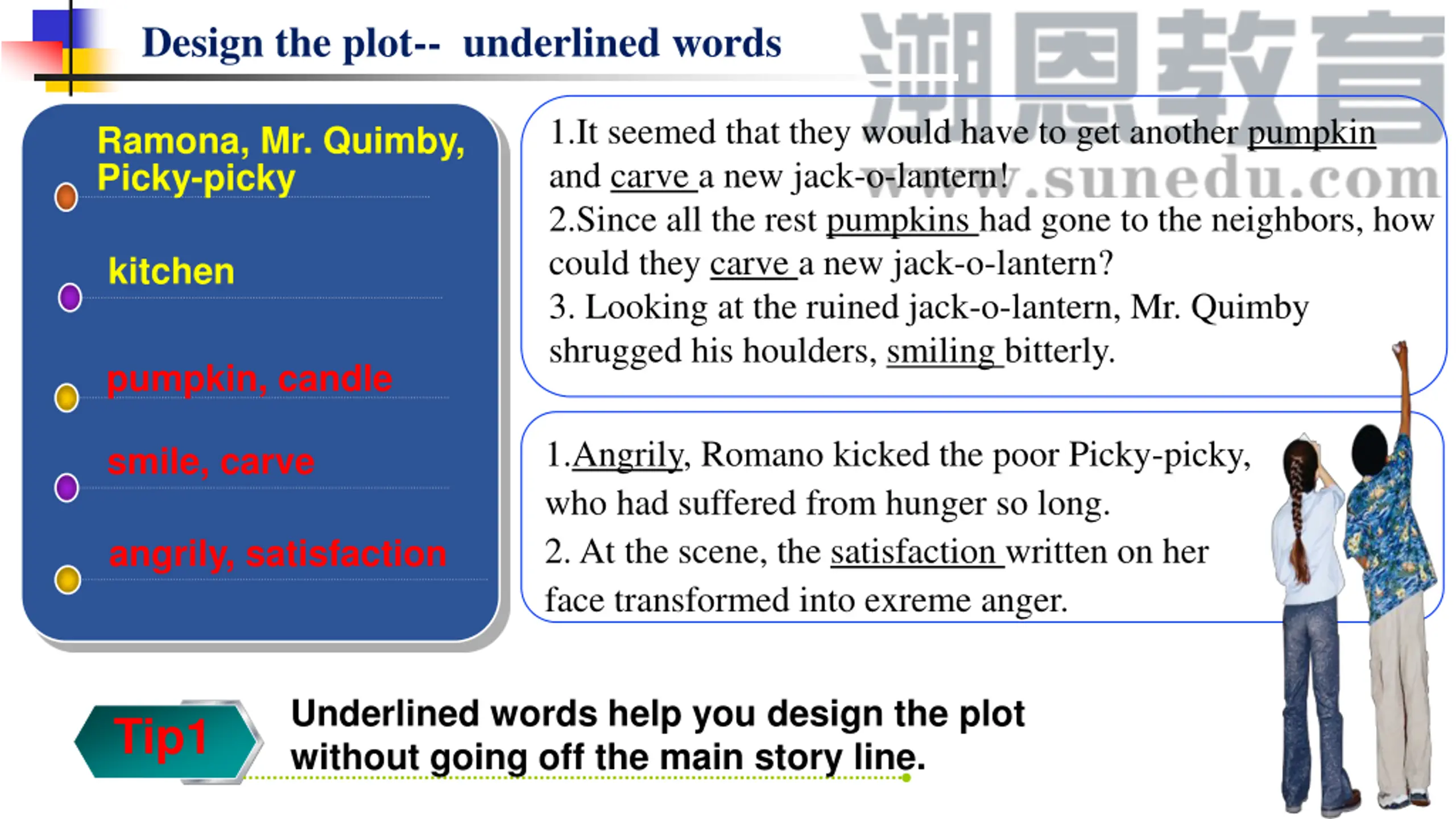 Design the plot-- underlined words 1.It seemed that they would have to get another pumpkin and carve a new jack-o-lantern! 2.Since all the rest pumpkins had gone to the neighbors, how could they carve a new jack-o-lantern? 3. Looking at the ruined jack-o-lantern, Mr. Quimby shrugged his houlders, smiling bitterly. Ramona, Mr. Quimby, Picky-picky kitchen pumpkin, candle 1.Angrily, Romano kicked the poor Picky-picky, who had suffered from hunger so long. 2. At the scene, the satisfaction written on her face transformed into exreme anger. smile, carve angrily, satisfaction Underlined words help you design the plot without going off the main story line. Tip1