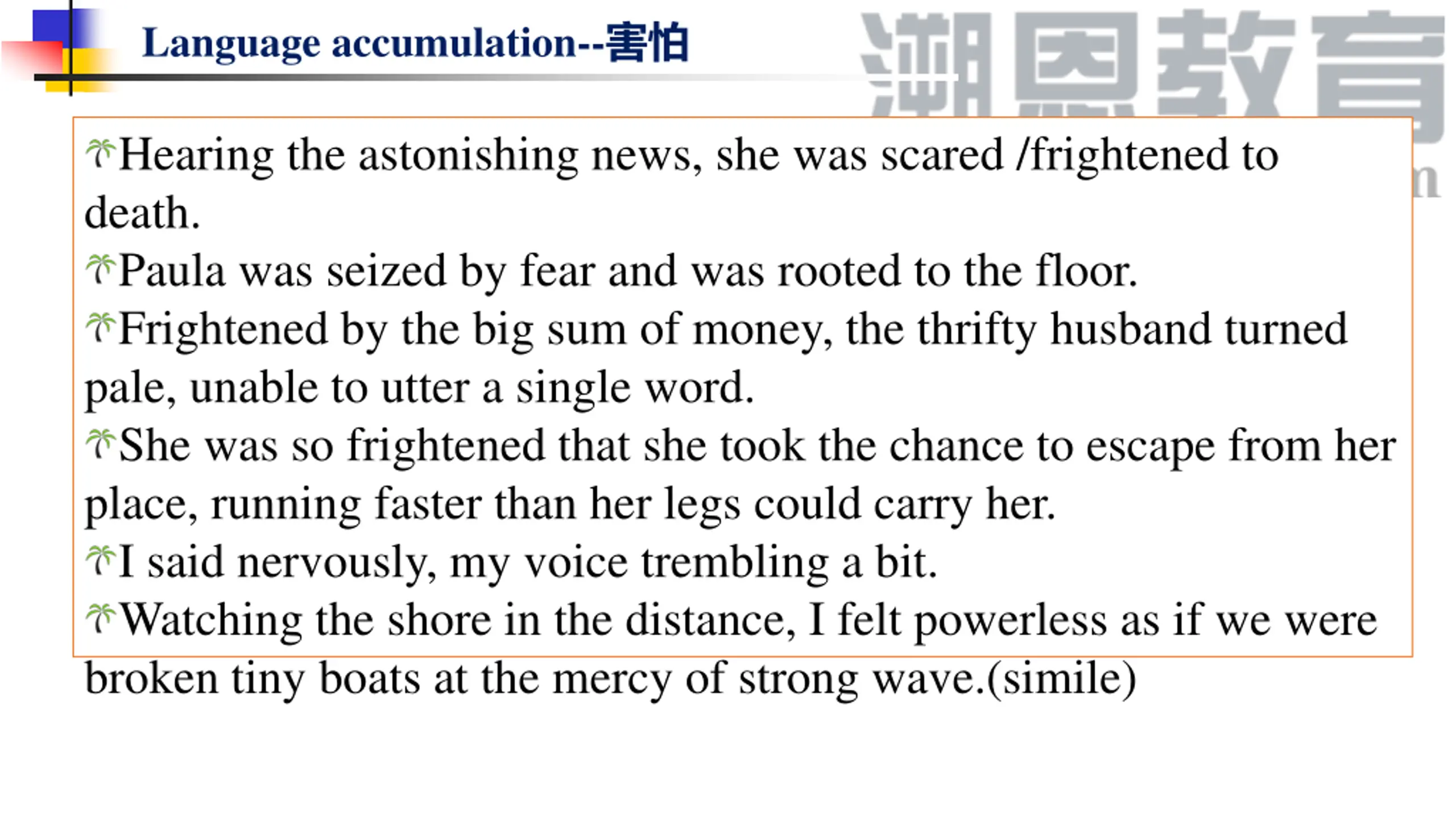 Language accumulation-- Hearing the astonishing news, she was scared /frightened to death. Paula was seized by fear and was rooted to the floor. Frightened by the big sum of money, the thrifty husband turned pale, unable to utter a single word. She was so frightened that she took the chance to escape from her place, running faster than her legs could carry her. I said nervously, my voice trembling a bit. Watching the shore in the distance, I felt powerless as if we were broken tiny boats at the mercy of strong wave.(simile)
