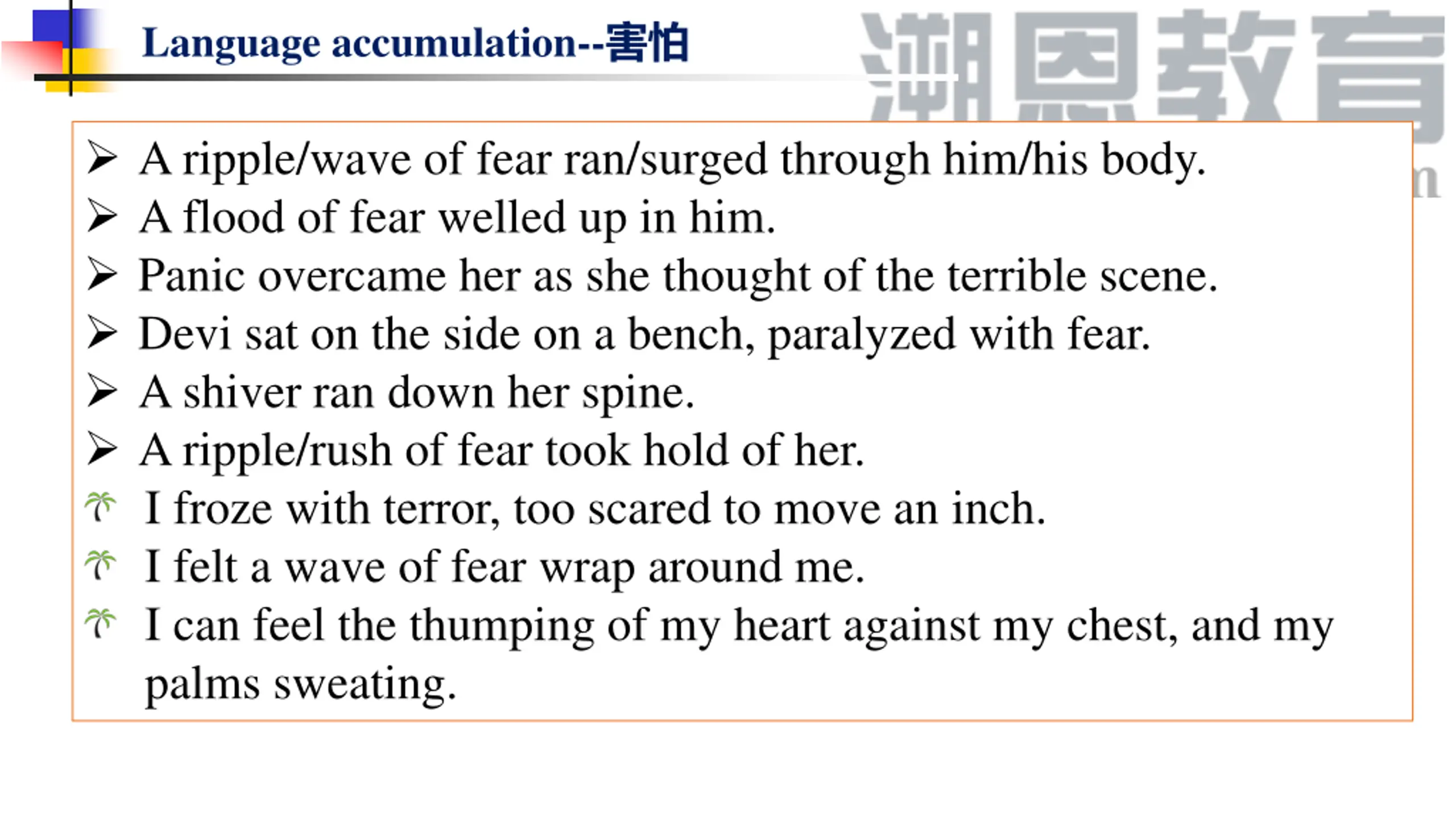 Language accumulation-- A ripple/wave of fear ran/surged through him/his body. Aflood of fear welled up in him. Panic overcame her as she thought of the terrible scene. Devi sat on the side on a bench, paralyzed with fear. A shiver ran down her spine. A ripple/rush of fear took hold of her. I froze with terror, too scared to move an inch. I felt a wave of fear wrap around me. I can feel the thumping of my heart against my chest, and my palms sweating.