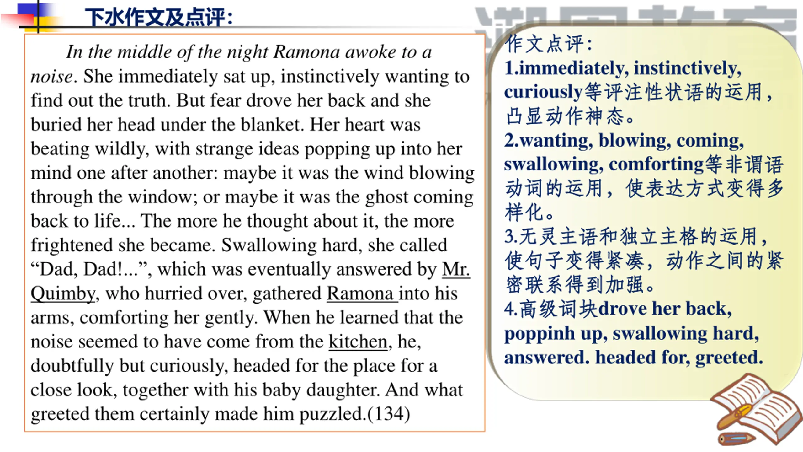 1.immediately, instinctively, curiously 2.wanting, blowing, coming, swallowing, comforting 3. 3. 4. 4. drove her back, poppinh up, swallowing hard, answered. headed for, greeted. In the middle of the night Ramona awoke to a noise. She immediately sat up, instinctively wanting to find out the truth. But fear drove her back and she buried her head under the blanket. Her heart was beating wildly, with strange ideas popping up into her mind one after another: maybe it was the wind blowing through the window; or maybe it was the ghost coming back to life... The more he thought about it, the more frightened she became. Swallowing hard, she called Dad, Dad!... , which was eventually answered by Mr. Quimby, who hurried over, gathered Ramona into his arms, comforting her gently. When he learned that the noise seemed to have come from the kitchen, he, doubtfully but curiously, headed for the place for a close look, together with his baby daughter. And what greeted them certainly made him puzzled.(134)