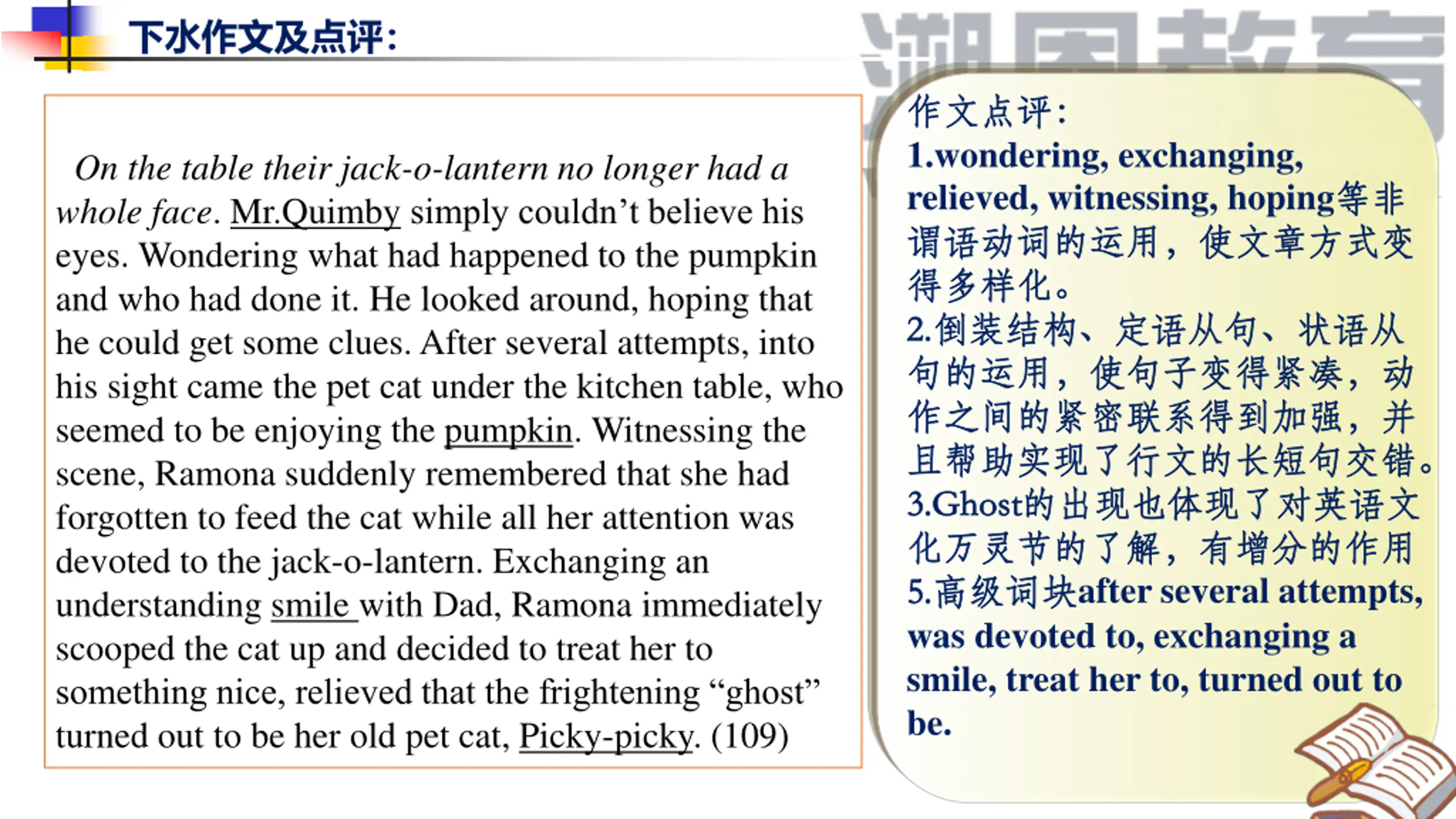 1.wondering, exchanging, relieved, witnessing, hoping 2. 2. 3.Ghost 3.Ghost 5. 5. after several attempts, was devoted to, exchanging a smile, treat her to, turned out to be. On the table their jack-o-lantern no longer had a whole face. Mr.Quimby simply couldn t believe his eyes. Wondering what had happened to the pumpkin and who had done it. He looked around, hoping that he could get some clues. After several attempts, into his sight came the pet cat under the kitchen table, who seemed to be enjoying the pumpkin. Witnessing the scene, Ramona suddenly remembered that she had forgotten to feed the cat while all her attention was devoted to the jack-o-lantern. Exchanging an understanding smile with Dad, Ramona immediately scooped the cat up and decided to treat her to something nice, relieved that the frightening ghost turned out to be her old pet cat, Picky-picky. (109)