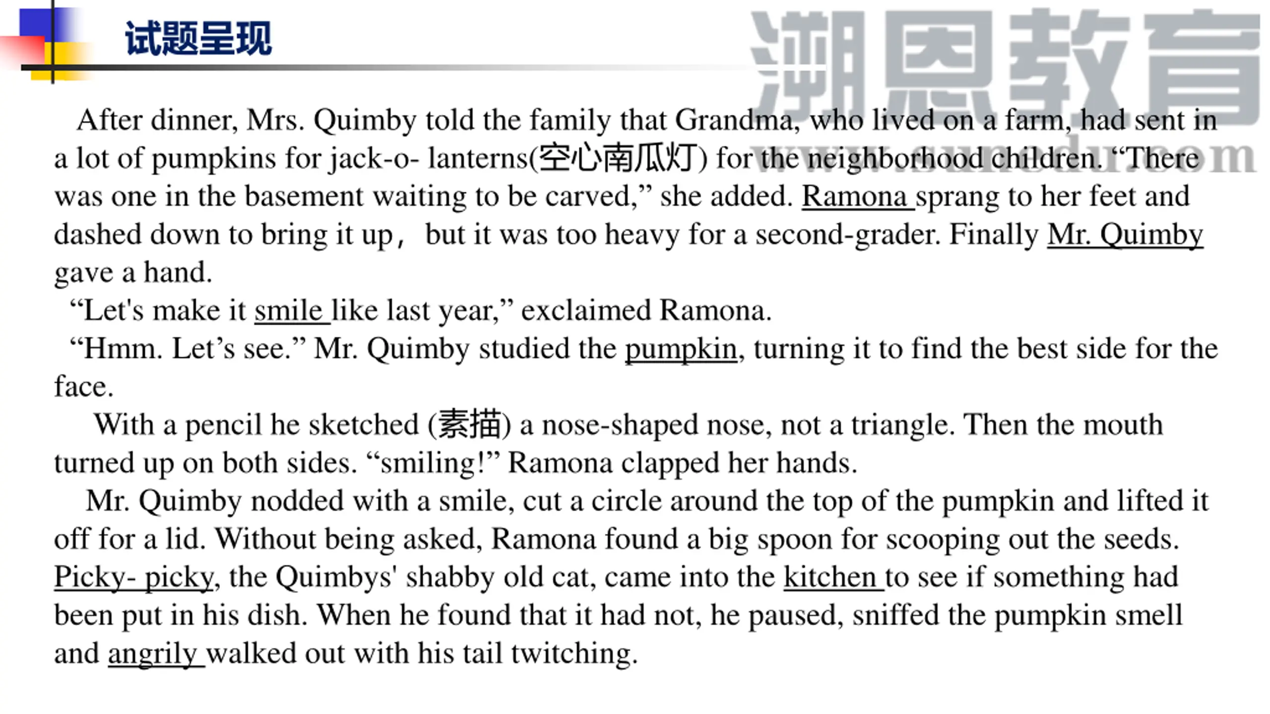After dinner, Mrs. Quimby told the family that Grandma, who lived on a farm, had sent in a lot of pumpkins for jack-o- lanterns( ) for the neighborhood children. There was one in the basement waiting to be carved, she added. Ramona sprang to her feet and dashed down to bring it up but it was too heavy for a second-grader. Finally Mr. Quimby gave a hand. Let's make it smile like last year, exclaimed Ramona. Hmm. Let s see. Mr. Quimby studied the pumpkin, turning it to find the best side for the face. With a pencil he sketched ( ) a nose-shaped nose, not a triangle. Then the mouth turned up on both sides. smiling! Ramona clapped her hands. Mr. Quimby nodded with a smile, cut a circle around the top of the pumpkin and lifted it off for a lid. Without being asked, Ramona found a big spoon for scooping out the seeds. Picky- picky, the Quimbys' shabby old cat, came into the kitchen to see if something had been put in his dish. When he found that it had not, he paused, sniffed the pumpkin smell and angrily walked out with his tail twitching.