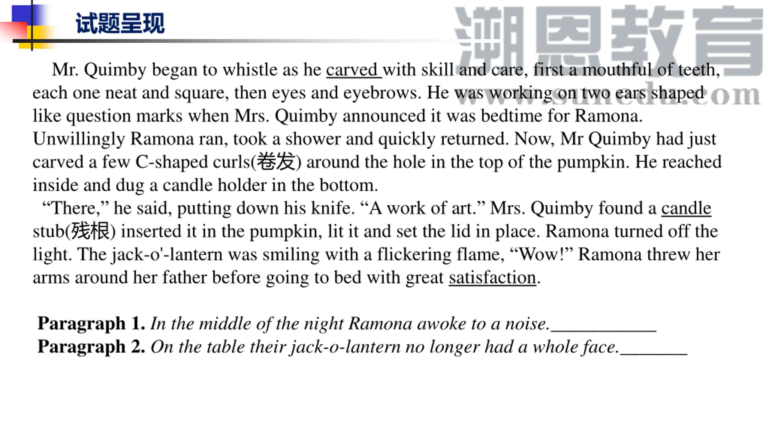 Mr. Quimby began to whistle as he carved with skill and care, first a mouthful of teeth, each one neat and square, then eyes and eyebrows. He was working on two ears shaped like question marks when Mrs. Quimby announced it was bedtime for Ramona. Unwillingly Ramona ran, took a shower and quickly returned. Now, Mr Quimby had just carved a few C-shaped curls( ) around the hole in the top of the pumpkin. He reached inside and dug a candle holder in the bottom. There, he said, putting down his knife. A work of art. Mrs. Quimby found a candle stub( ) inserted it in the pumpkin, lit it and set the lid in place. Ramona turned off the light. The jack-o'-lantern was smiling with a flickering flame, Wow! Ramona threw her arms around her father before going to bed with great satisfaction. Paragraph 1. In the middle of the night Ramona awoke to a noise.___________ Paragraph 2. On the table their jack-o-lantern no longer had a whole face._______