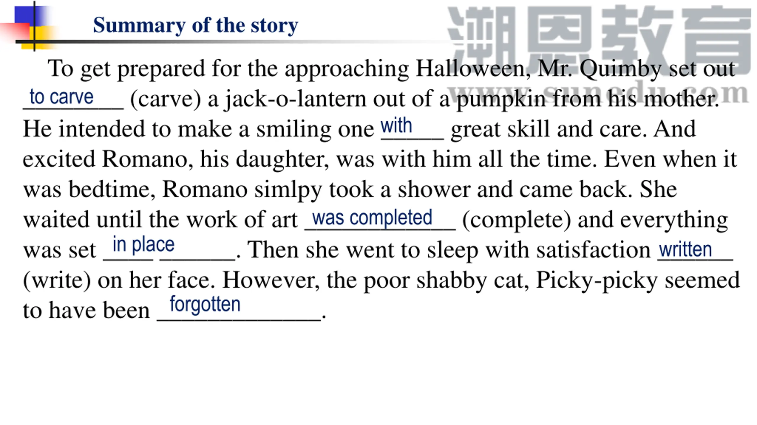Summary of the story To get prepared for the approaching Halloween, Mr. Quimby set out ________ (carve) a jack-o-lantern out of a pumpkin from his mother. He intended to make a smiling one _____ great skill and care. And excited Romano, his daughter, was with him all the time. Even when it was bedtime, Romano simlpy took a shower and came back. She waited until the work of art ____________ (complete) and everything was set ____ ______. Then she went to sleep with satisfaction ______ (write) on her face. However, the poor shabby cat, Picky-picky seemed to have been _____________. forgotten to carve with was completed in place written