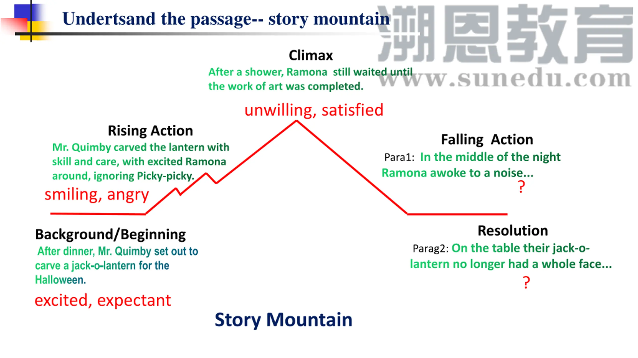 Undertsand the passage-- story mountain Climax After a shower, Ramona still waited until the work of art was completed. unwilling, satisfied Rising Action Falling Action Mr. Quimby carved the lantern with skill and care, with excited Ramona around, ignoring Picky-picky. smiling, angry Para1: In the middle of the night Ramona awoke to a noise... ? Resolution Background/Beginning After dinner, Mr. Quimby set out to carve a jack-o-lantern for the Halloween. excited, expectant Parag2: On the table their jack-o- lantern no longer had a whole face... ? Story Mountain
