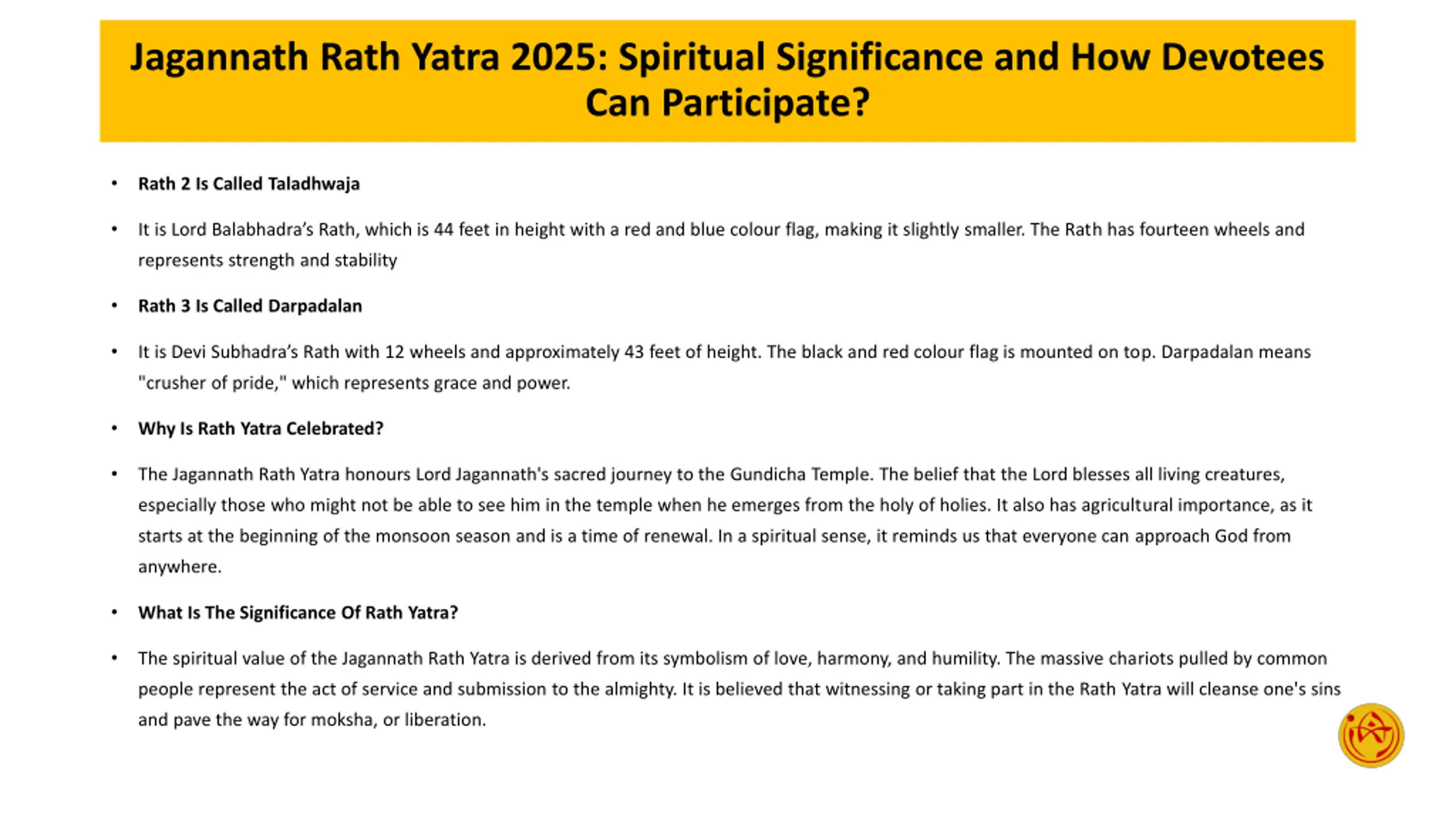 Jagannath Rath Yatra 2025: Spiritual Significance and How Devotees Can Participate? Rath 2 Is Called Taladhwaja It is Lord Balabhadra s Rath, which is 44 feet in height with a red and blue colour flag, making it slightly smaller. The Rath has fourteen wheels and represents strength and stability Rath 3 Is Called Darpadalan It is Devi Subhadra s Rath with 12 wheels and approximately 43 feet of height. The black and red colour flag is mounted on top. Darpadalan means "crusher of pride," which represents grace and power. Why Is Rath Yatra Celebrated? The Jagannath Rath Yatra honours Lord Jagannath's sacred journey to the Gundicha Temple. The belief that the Lord blesses all living creatures, especially those who might not be able to see him in the temple when he emerges from the holy of holies. It also has agricultural importance, as it starts at the beginning of the monsoon season and is a time of renewal. In a spiritual sense, it reminds us that everyone can approach God from anywhere. What Is The Significance Of Rath Yatra? The spiritual value of the Jagannath Rath Yatra is derived from its symbolism of love, harmony, and humility. The massive chariots pulled by common people represent the act of service and submission to the almighty. It is believed that witnessing or taking part in the Rath Yatra will cleanse one's sins and pave the way for moksha, or liberation.