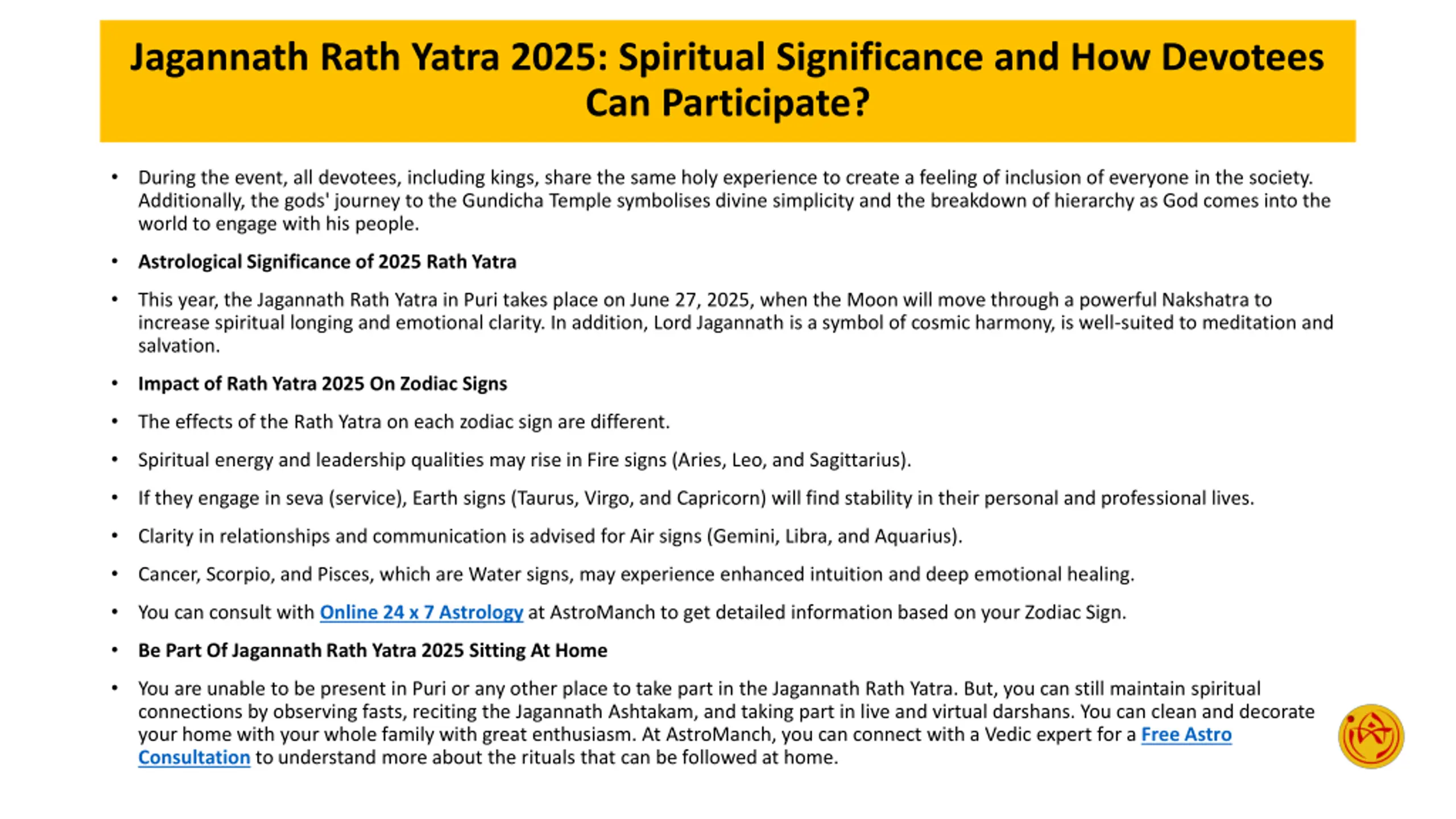 Jagannath Rath Yatra 2025: Spiritual Significance and How Devotees Can Participate? During the event, all devotees, including kings, share the same holy experience to create a feeling of inclusion of everyone in the society. Additionally, the gods' journey to the Gundicha Temple symbolises divine simplicity and the breakdown of hierarchy as God comes into the world to engage with his people. Astrological Significance of 2025 Rath Yatra This year, the Jagannath Rath Yatra in Puri takes place on June 27, 2025, when the Moon will move through a powerful Nakshatra to increase spiritual longing and emotional clarity. In addition, Lord Jagannath is a symbol of cosmic harmony, is well-suited to meditation and salvation. Impact of Rath Yatra 2025 On Zodiac Signs The effects of the Rath Yatra on each zodiac sign are different. Spiritual energy and leadership qualities may rise in Fire signs (Aries, Leo, and Sagittarius). If they engage in seva (service), Earth signs (Taurus, Virgo, and Capricorn) will find stability in their personal and professional lives. Clarity in relationships and communication is advised for Air signs (Gemini, Libra, and Aquarius). Cancer, Scorpio, and Pisces, which are Water signs, may experience enhanced intuition and deep emotional healing. You can consult with Online 24 x 7 Astrology at AstroManch to get detailed information based on your Zodiac Sign. Be Part Of Jagannath Rath Yatra 2025 Sitting At Home You are unable to be present in Puri or any other place to take part in the Jagannath Rath Yatra. But, you can still maintain spiritual connections by observing fasts, reciting the Jagannath Ashtakam, and taking part in live and virtual darshans. You can clean and decorate your home with your whole family with great enthusiasm. At AstroManch, you can connect with a Vedic expert for a Free Astro Consultation to understand more about the rituals that can be followed at home.