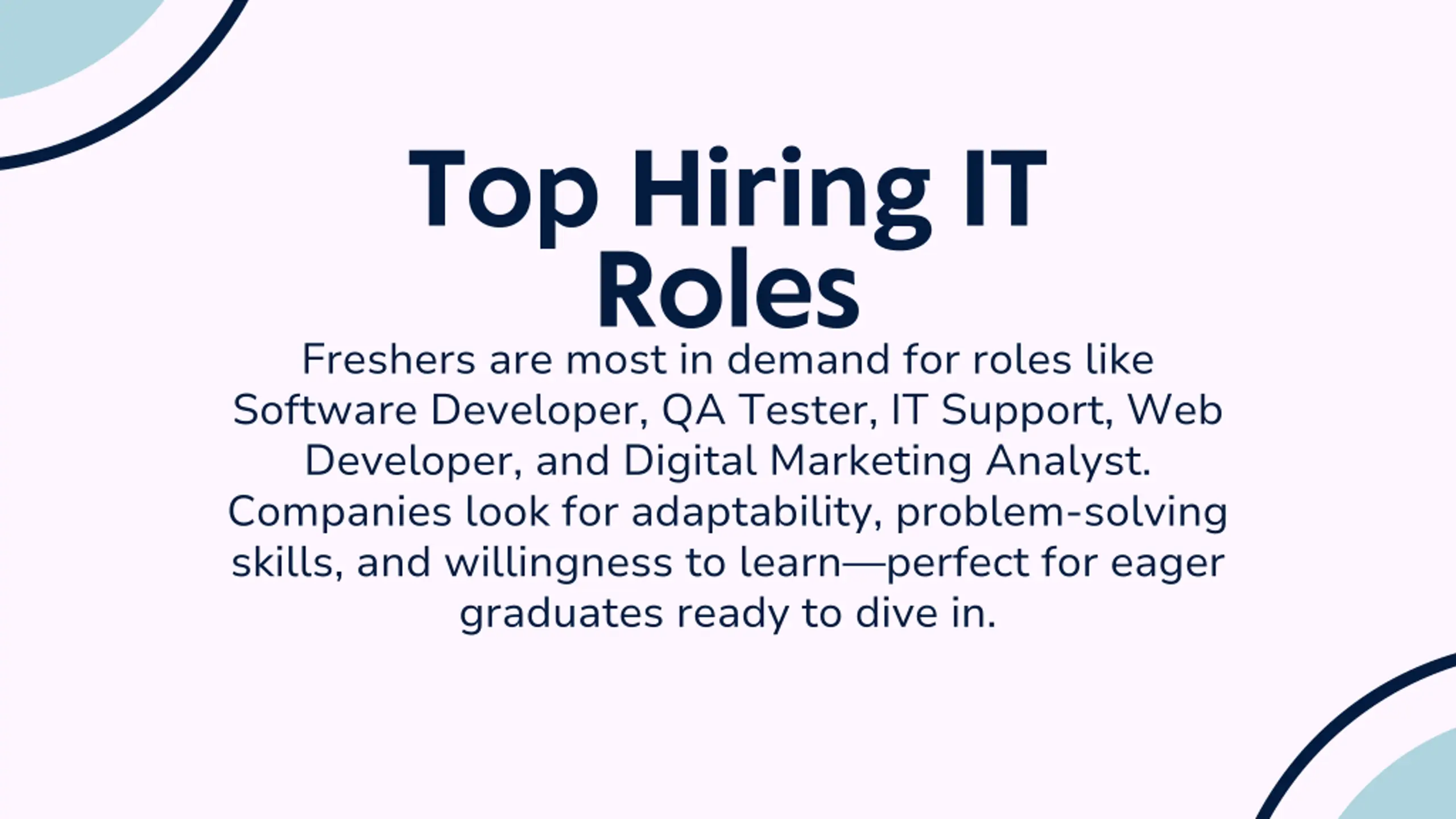 Top Hiring IT Roles Freshers are most in demand for roles like Software Developer, QA Tester, IT Support, Web Developer, and Digital Marketing Analyst. Companies look for adaptability, problem-solving skills, and willingness to learn perfect for eager graduates ready to dive in.