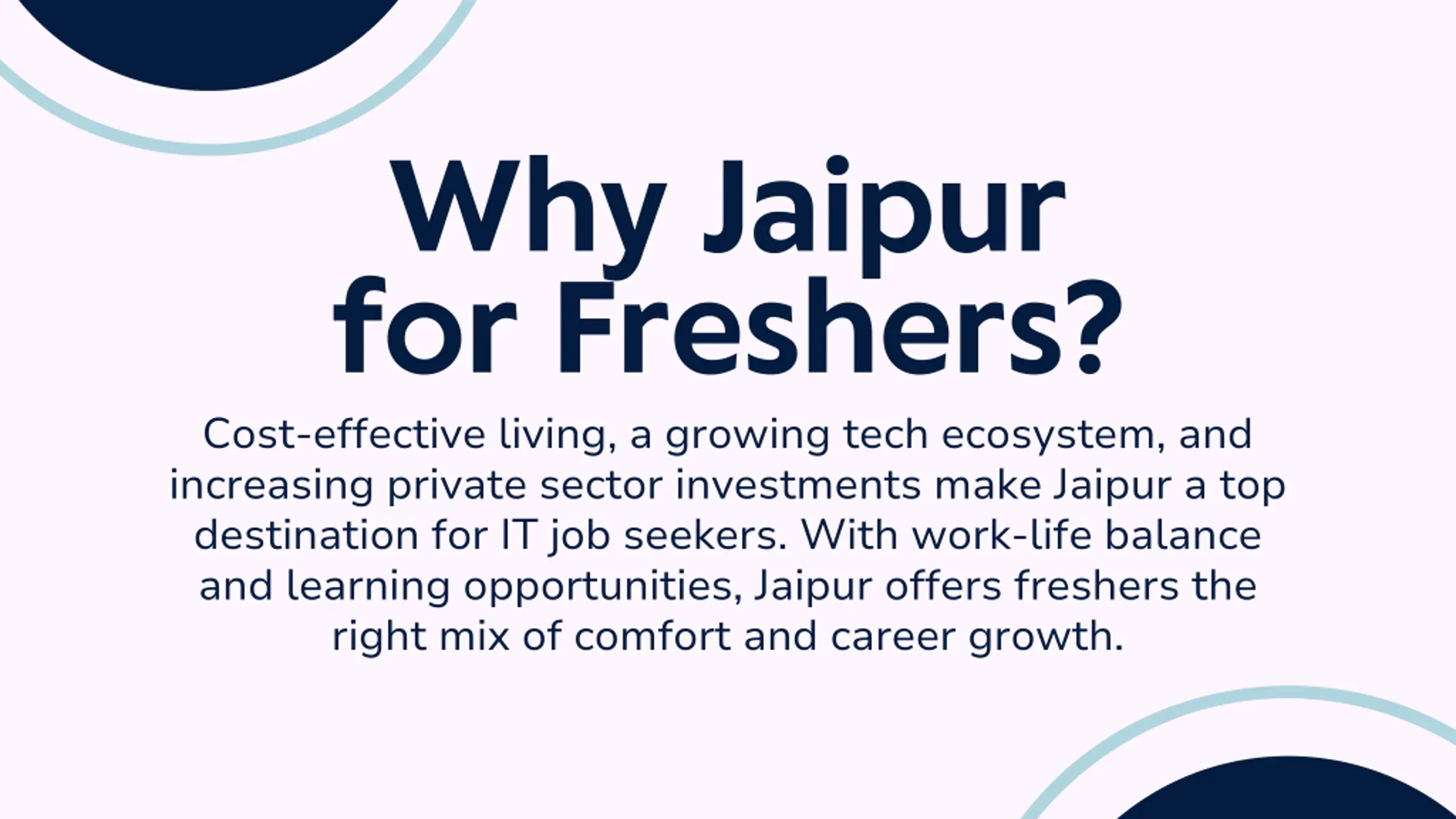 Why Jaipur for Freshers? Cost-effective living, a growing tech ecosystem, and increasing private sector investments make Jaipur a top destination for IT job seekers. With work-life balance and learning opportunities, Jaipur offers freshers the right mix of comfort and career growth.
