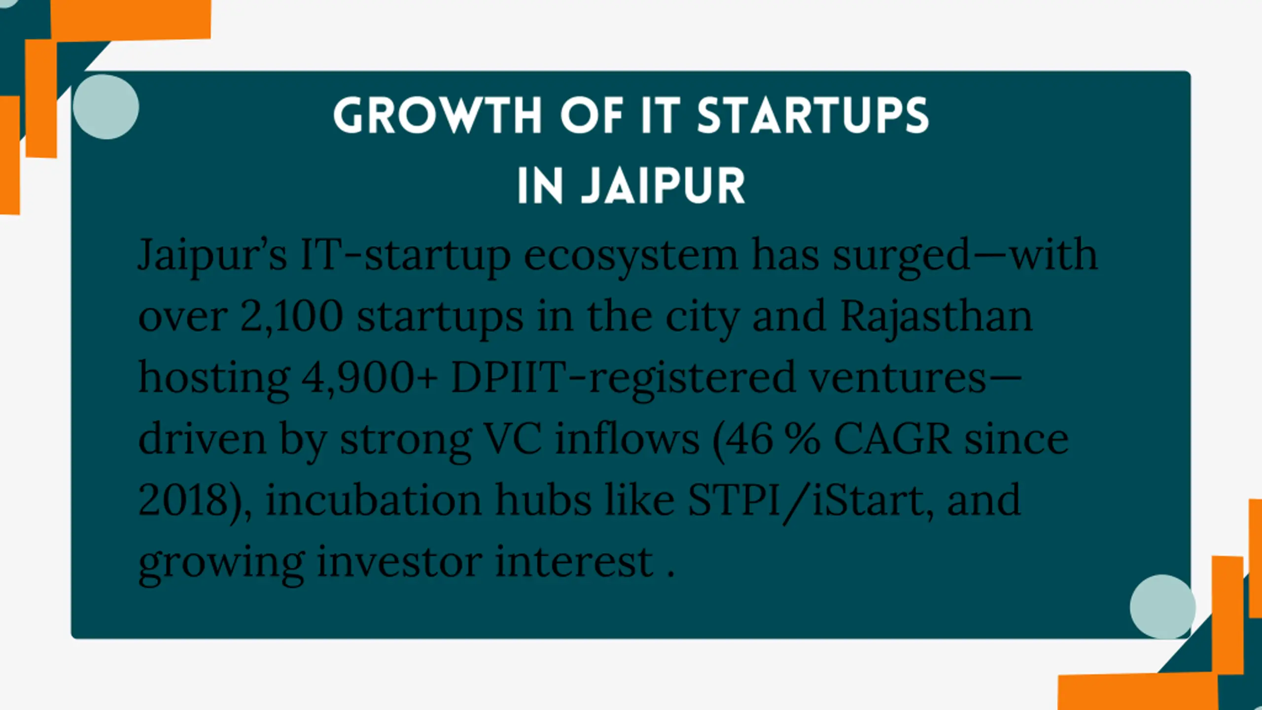 Jaipurs IT-startup ecosystem has surgedwith over 2,100 startups in the city and Rajasthan hosting 4,900+ DPIIT-registered ventures driven by strong VC inflows (46% CAGR since 2018), incubation hubs like STPI/iStart, and growing investor interest .