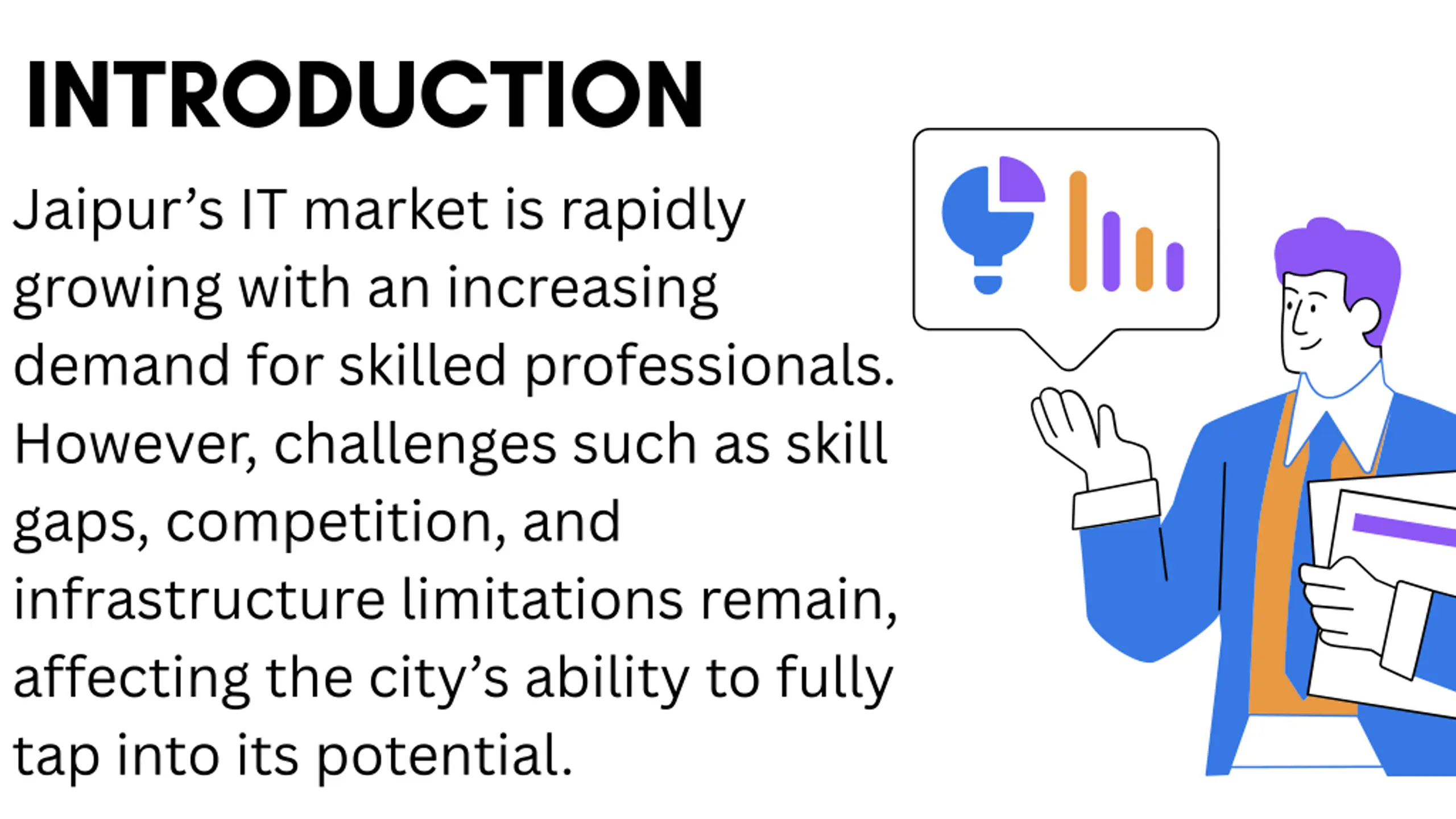 INTRODUCTION Jaipur s IT market is rapidly growing with an increasing demand for skilled professionals. However, challenges such as skill gaps, competition, and infrastructure limitations remain, affecting the city s ability to fully tap into its potential.
