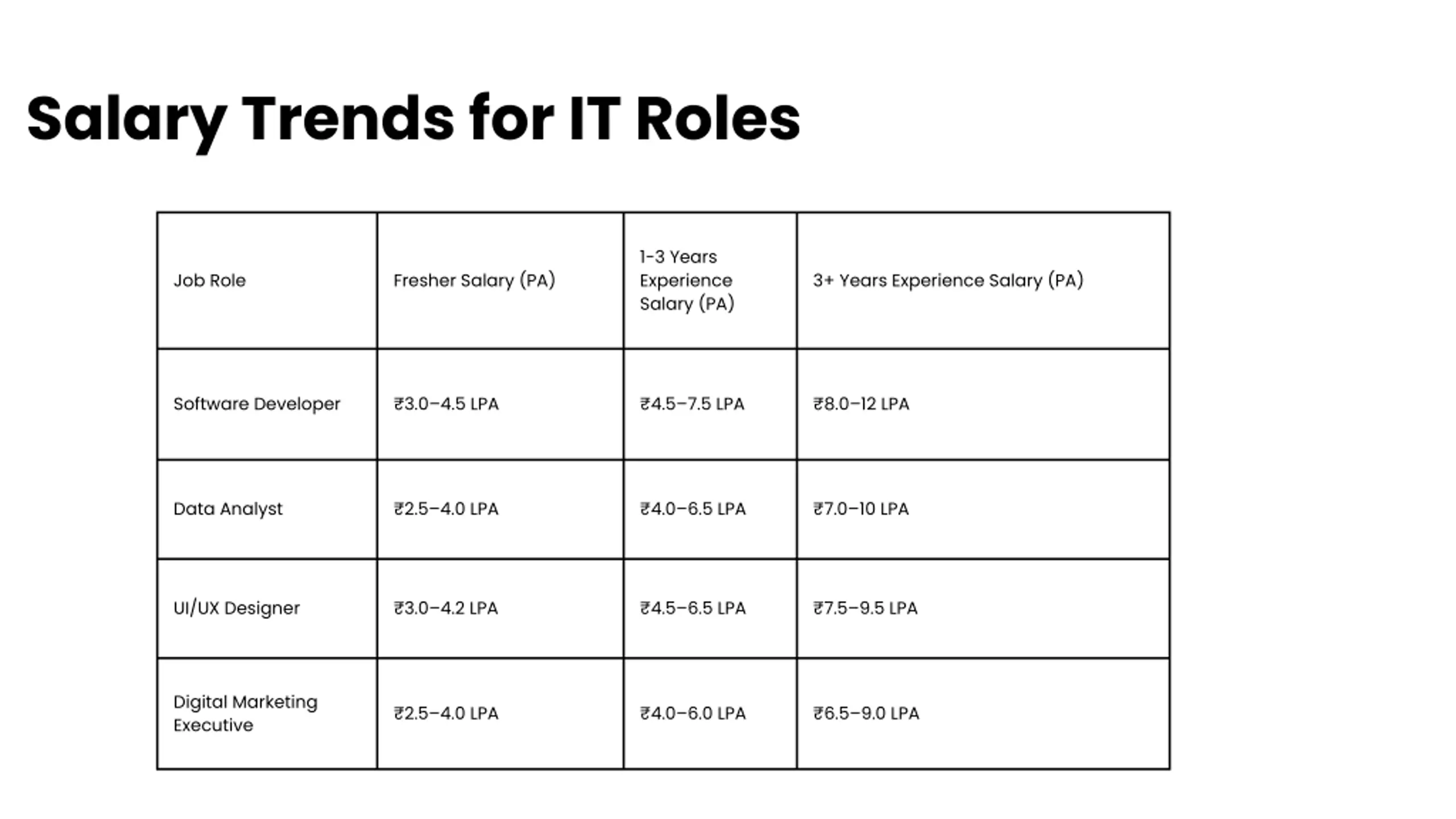 Salary Trends for IT Roles 1-3 Years Experience Salary (PA) Job Role Fresher Salary (PA) 3+ Years Experience Salary (PA) Software Developer 3.0 4.5 LPA 4.5 7.5 LPA 8.0 12 LPA Data Analyst 2.5 4.0 LPA 4.0 6.5 LPA 7.0 10 LPA UI/UX Designer 3.0 4.2 LPA 4.5 6.5 LPA 7.5 9.5 LPA Digital Marketing Executive 2.5 4.0 LPA 4.0 6.0 LPA 6.5 9.0 LPA