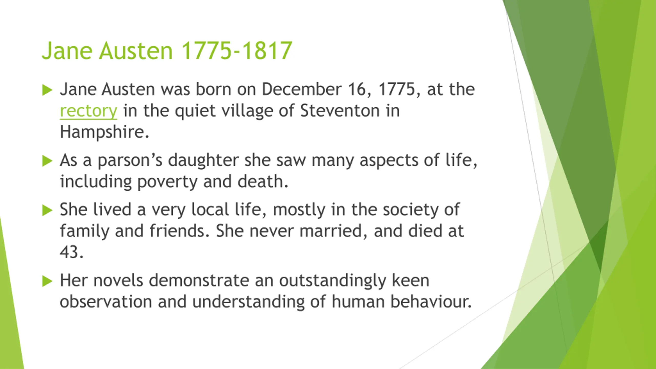 Jane Austen 1775-1817 Jane Austen was born on December 16, 1775, at the rectory in the quiet village of Steventon in Hampshire. As a parson s daughter she saw many aspects of life, including poverty and death. She lived a very local life, mostly in the society of family and friends. She never married, and died at 43. Her novels demonstrate an outstandingly keen observation and understanding of human behaviour.