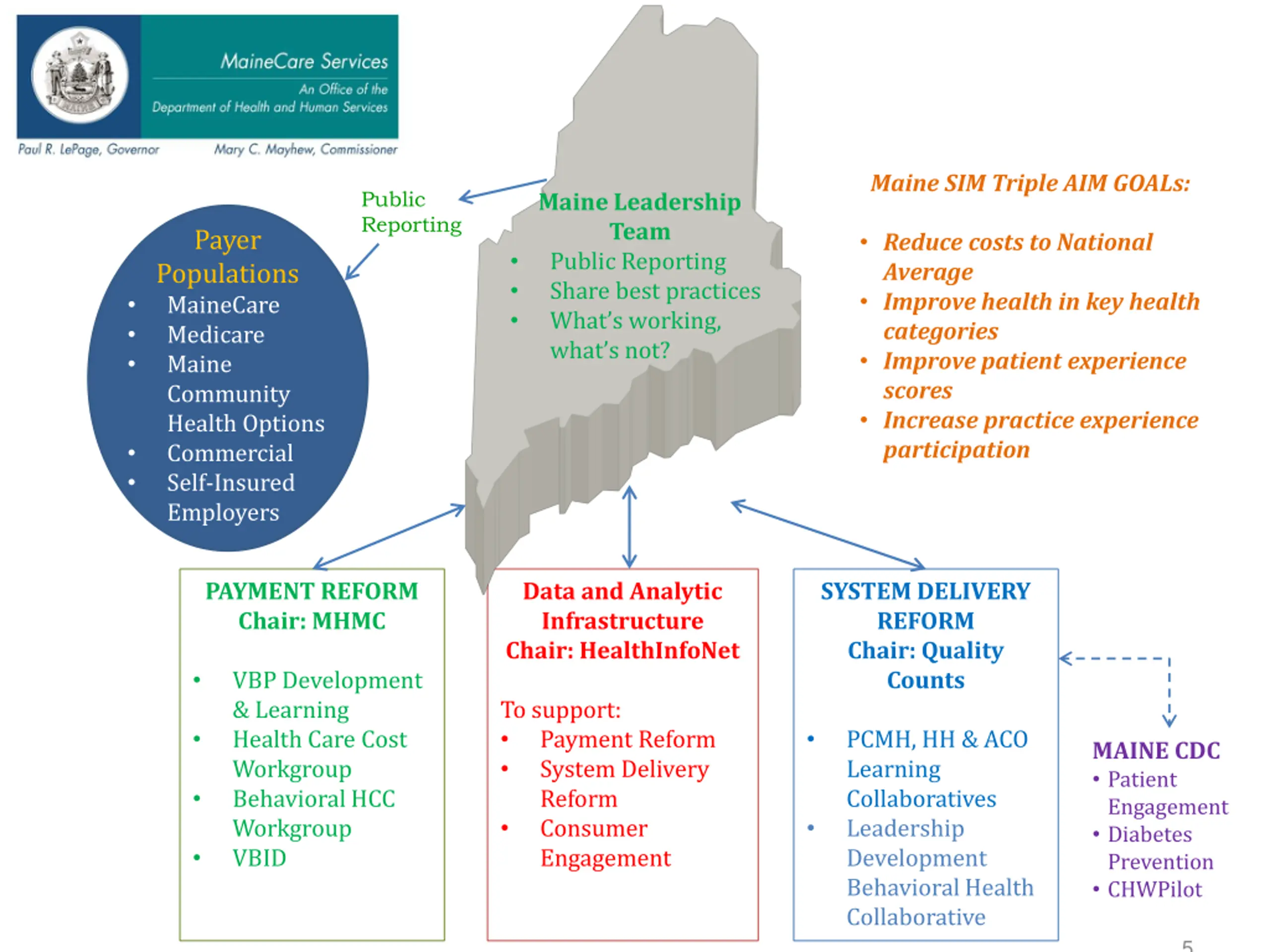 Maine SIM Triple AIM GOALs: Public Reporting Maine Leadership Team Public Reporting Share best practices What s working, what s not? Reduce costs to National Average Improve health in key health categories Improve patient experience scores Increase practice experience participation Payer Populations MaineCare Medicare Maine Community Health Options Commercial Self-Insured Employers PAYMENT REFORM Chair: MHMC Data and Analytic Infrastructure Chair: HealthInfoNet SYSTEM DELIVERY REFORM Chair: Quality Counts VBP Development & Learning Health Care Cost Workgroup Behavioral HCC Workgroup VBID To support: Payment Reform System Delivery Reform Consumer Engagement PCMH, HH & ACO Learning Collaboratives Leadership Development Behavioral Health Collaborative MAINE CDC Patient Engagement Diabetes Prevention CHWPilot 5