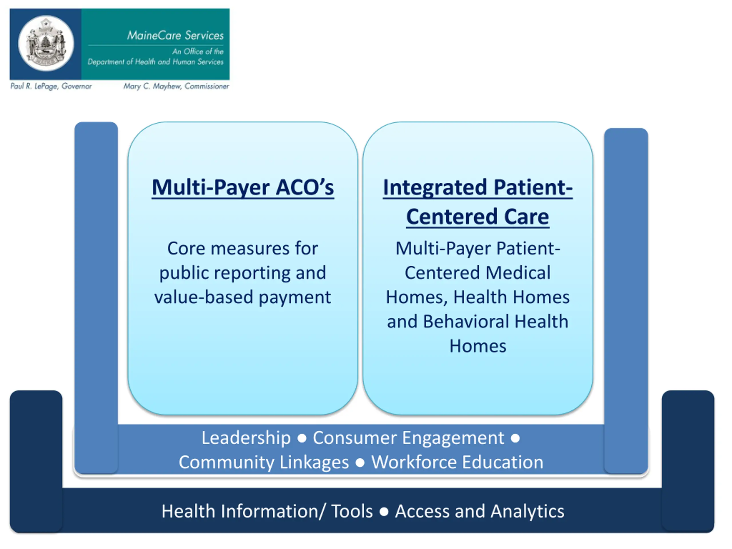 Timeline Pre- existing Jan- 13 Oct-13 Model Oct-14 Oct-15 Oct-16 SIM PCMH FQHC APC Health Homes Behav Health Homes Pioneer ACOs MSSP ACOs Commercial ACOs ACO MaineCare 10