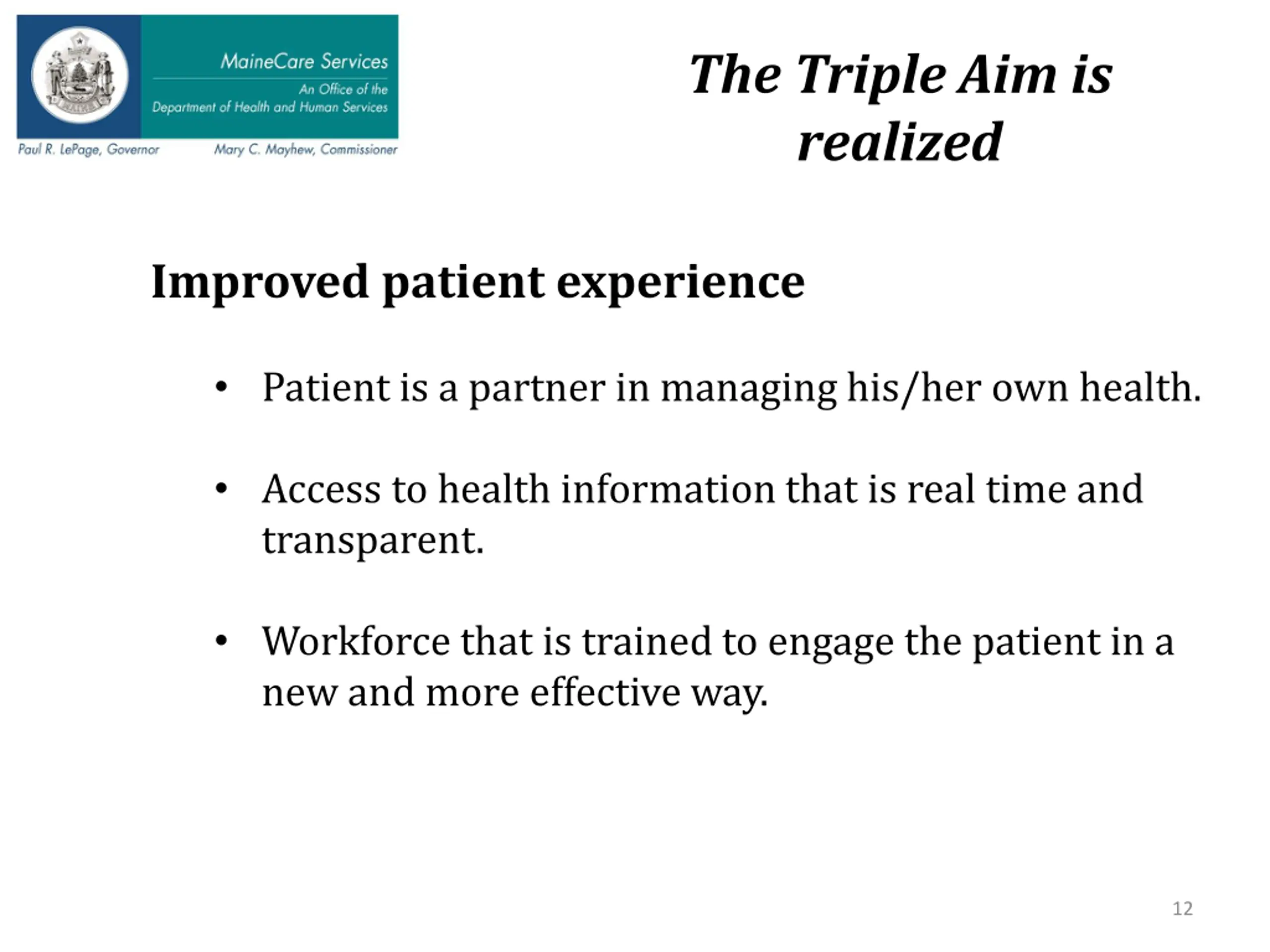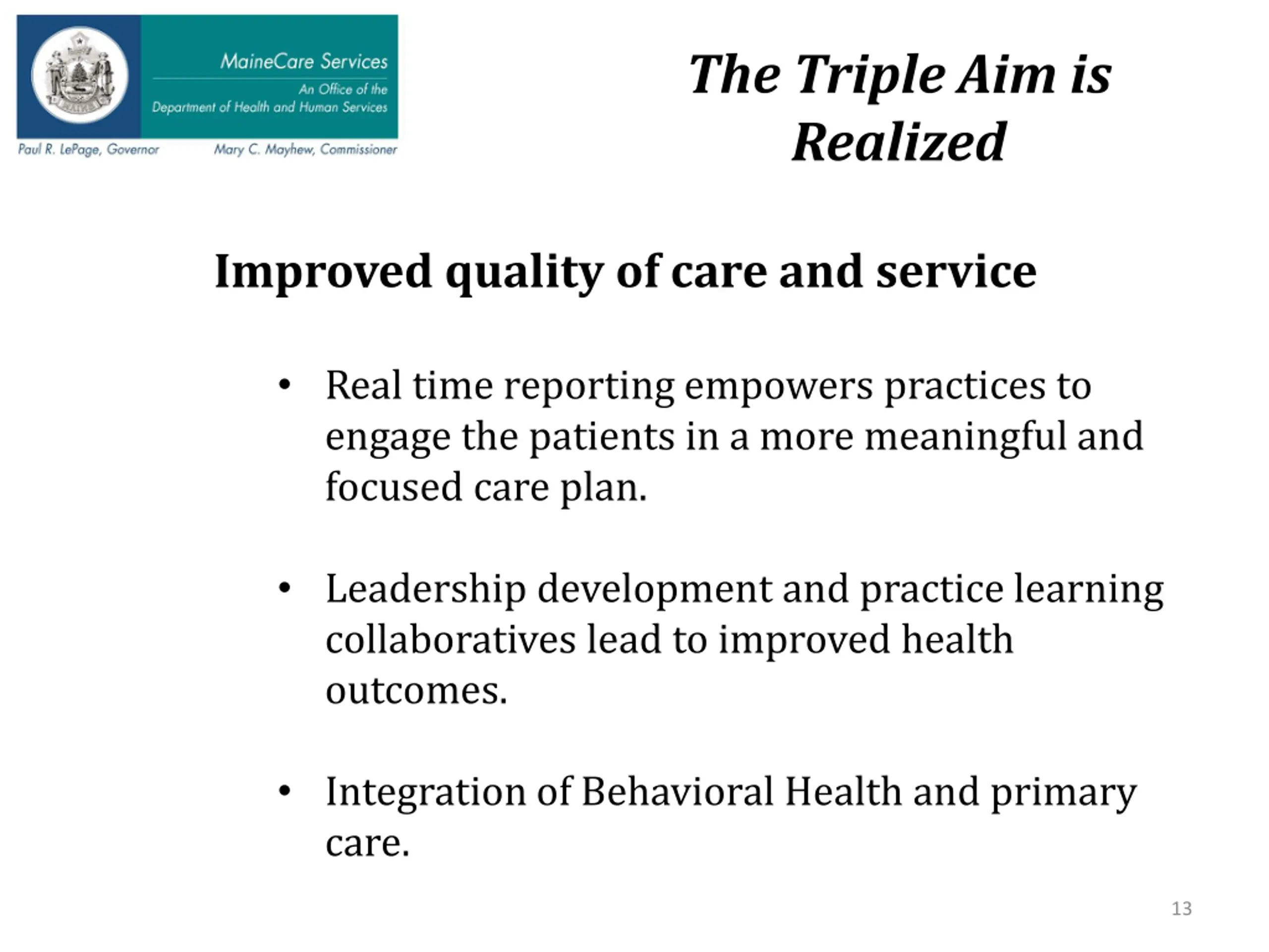 The Triple Aim is realized Improved patient experience Patient is a partner in managing his/her own health. Access to health information that is real time and transparent. Workforce that is trained to engage the patient in a new and more effective way. 12