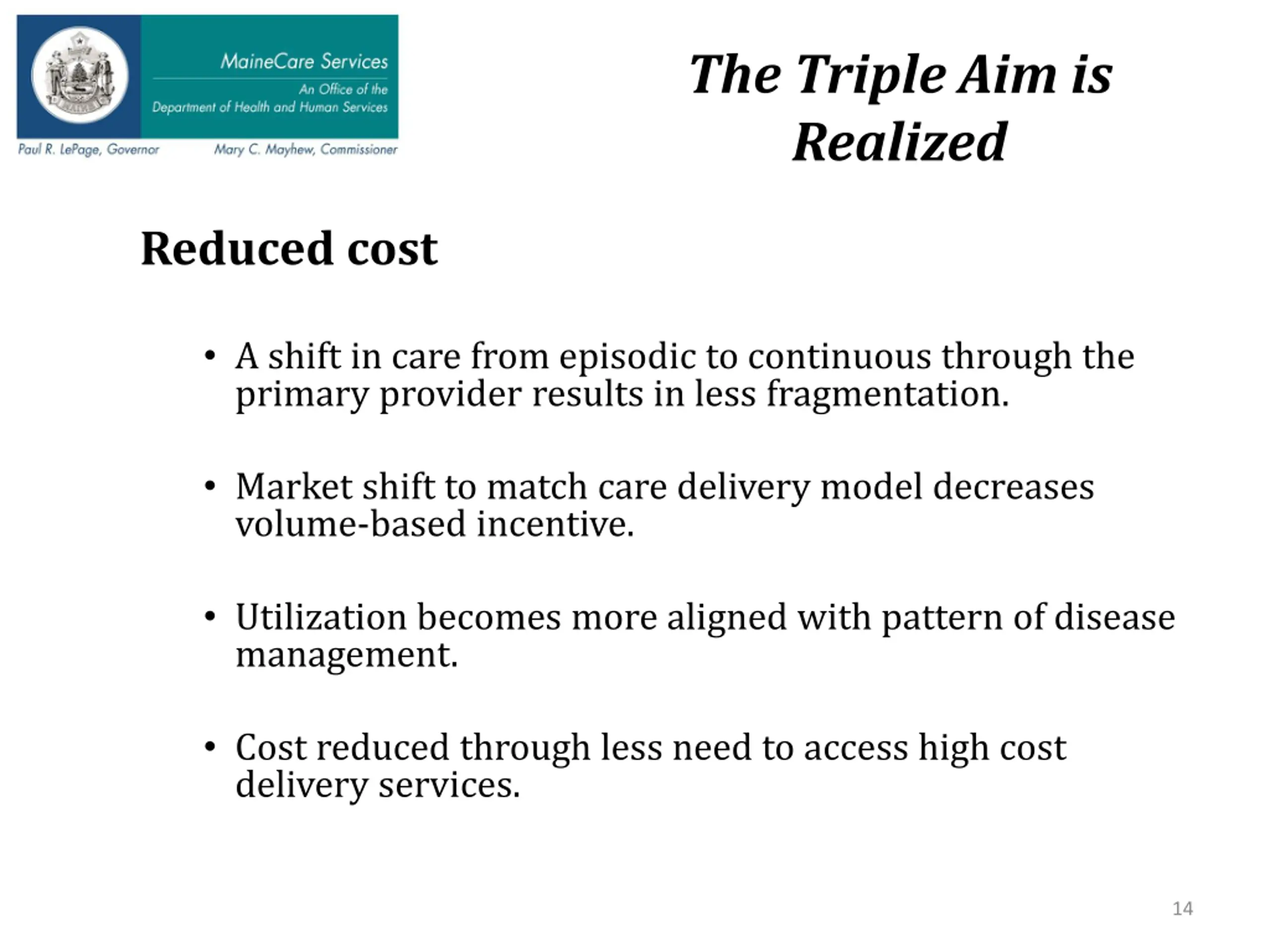 The Triple Aim is Realized Improved quality of care and service Real time reporting empowers practices to engage the patients in a more meaningful and focused care plan. Leadership development and practice learning collaboratives lead to improved health outcomes. Integration of Behavioral Health and primary care. 13
