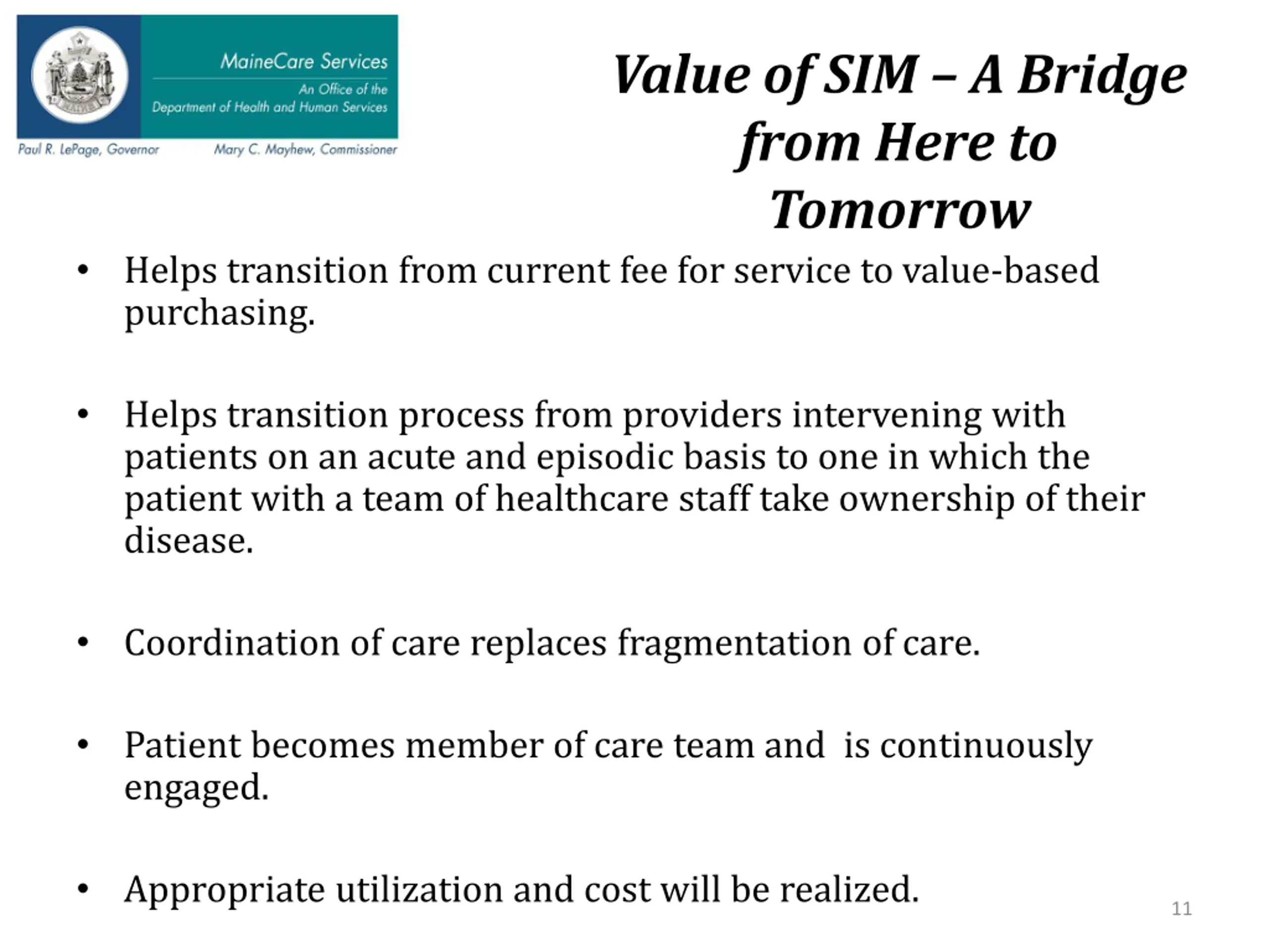 Value of SIM A Bridge from Here to Tomorrow Helps transition from current fee for service to value-based purchasing. Helps transition process from providers intervening with patients on an acute and episodic basis to one in which the patient with a team of healthcare staff take ownership of their disease. Coordination of care replaces fragmentation of care. Patient becomes member of care team and is continuously engaged. Appropriate utilization and cost will be realized. 11