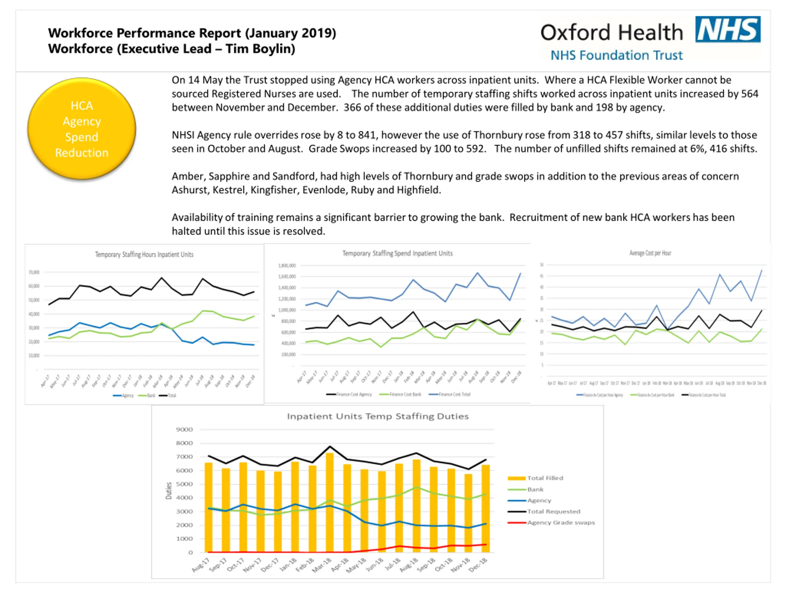 Workforce Performance Report (January 2019) Workforce (Executive Lead Tim Boylin) Agency Spend increased most significantly in Bucks and Oxford & SW Mental Health directorates . Bank spend increased significantly in community services and Oxfordshire & SW Mental Health. Total temporary staffing spend increased most significantly in Community and Oxfordshire &SW Mental Health Directorates. NHSI agency rule overrides fell for the third month in a row. Temporary Staffing Spend