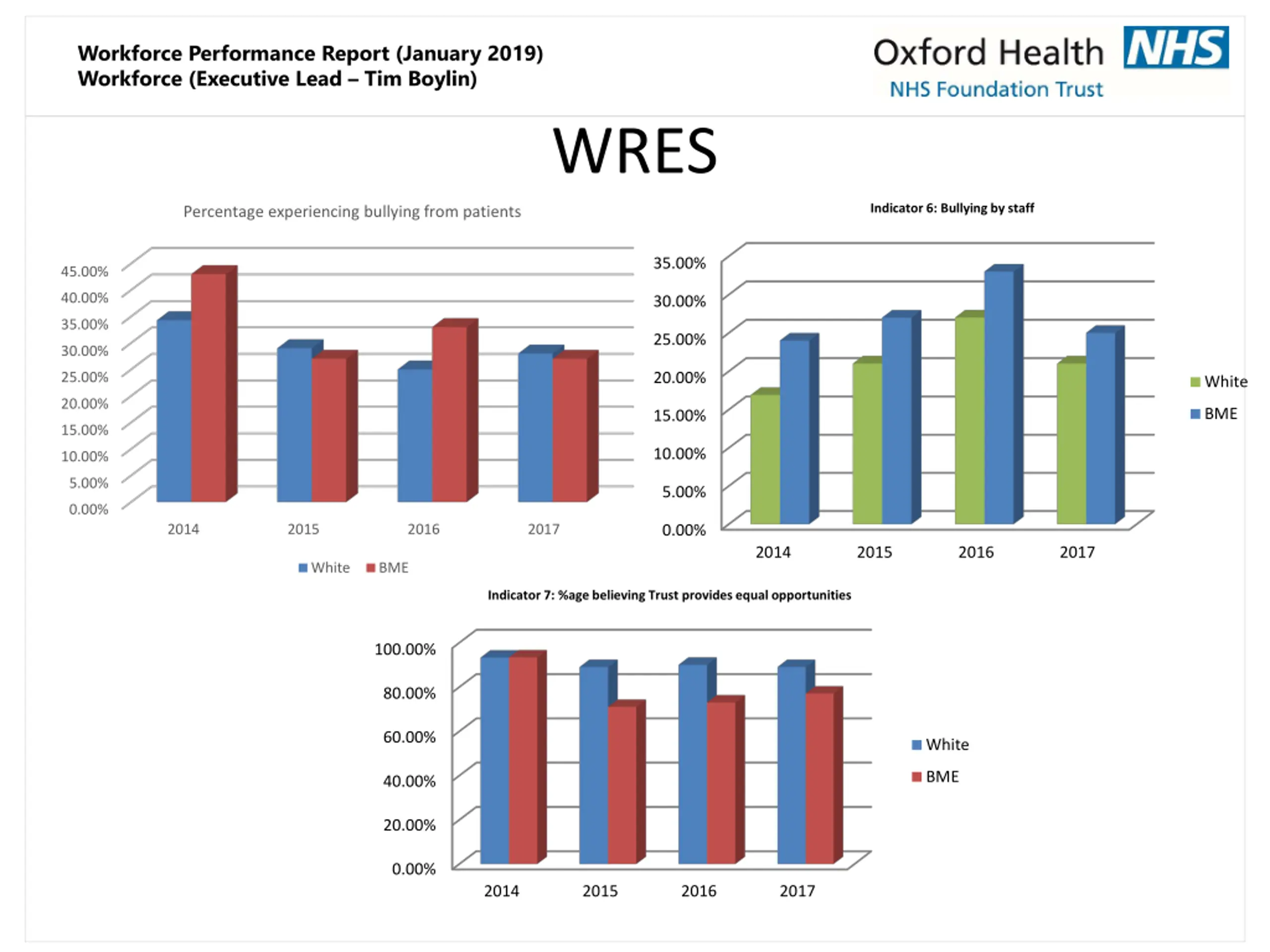Workforce Performance Report (January 2019) Workforce (Executive Lead Tim Boylin) WRES Indicators 1& 2 - Chart showing NHS Jobs applicants ethnic origin Indicator 2: Likelihood of being appointed 80.00% 80.00% 70.00% 70.00% 60.00% 60.00% 50.00% 50.00% White Applicants White Applicants 40.00% 40.00% BME applicants BME applicants 30.00% 30.00% Not disclosed Not disclosed 20.00% 20.00% 10.00% 10.00% 0.00% 0.00% July Dec Sep Nov April Jan-18 Aug May June March Oct Sept July Dec Feb Nov April Aug May Jan-18 June March Oct Feb Indicator 3: Likelihood of BME staff entering disciplinary process Note: 83% of staff are white, 17% from other groups 80.00% 70.00% 60.00% 50.00% White 40.00% BME 30.00% Not disclosed 20.00% 10.00% 0.00% July Sept Feb Nov Dec Aug April Jan-18 May Oct June March