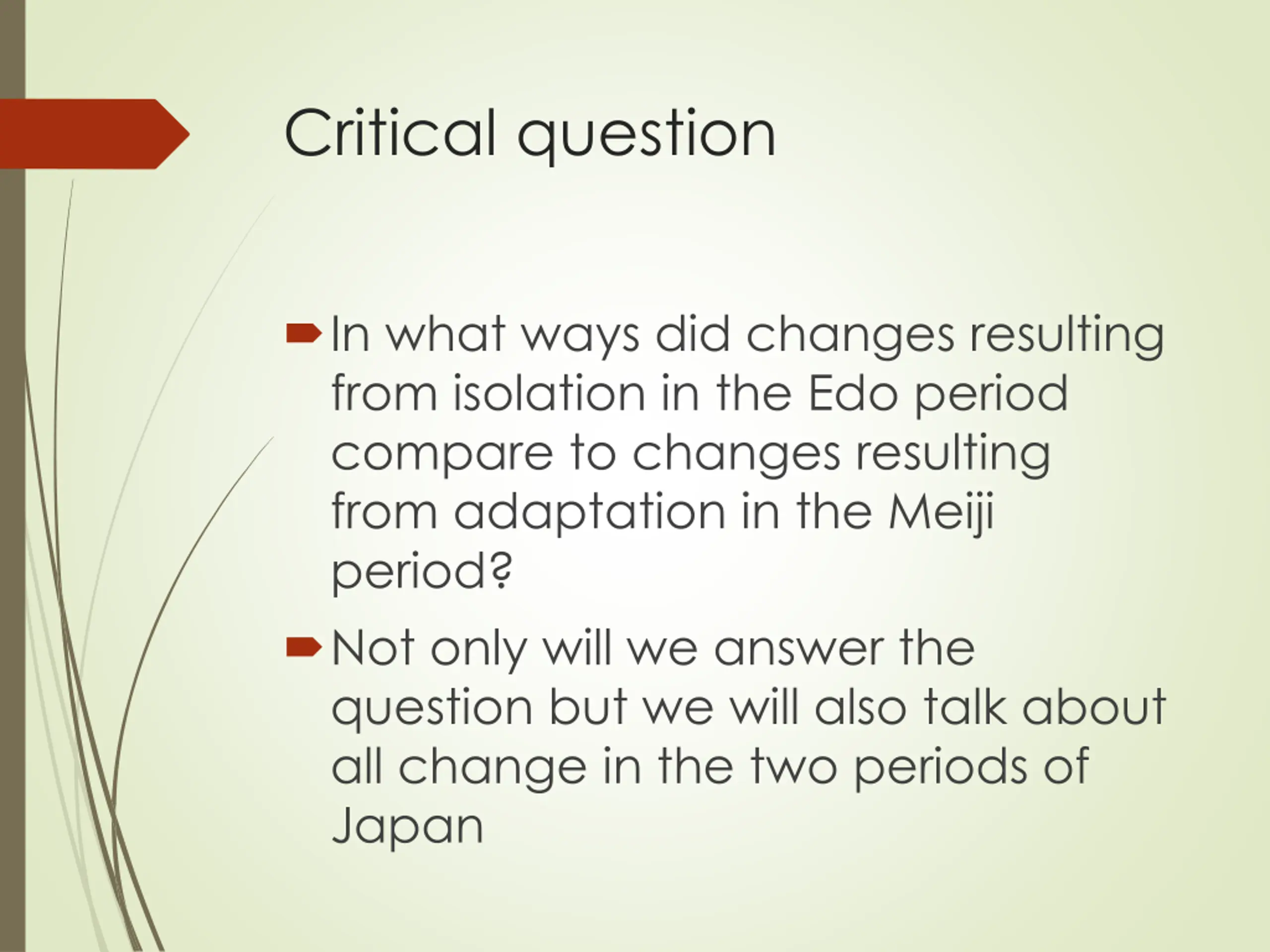 Critical question In what ways did changes resulting from isolation in the Edo period compare to changes resulting from adaptation in the Meiji period? Not only will we answer the question but we will also talk about all change in the two periods of Japan