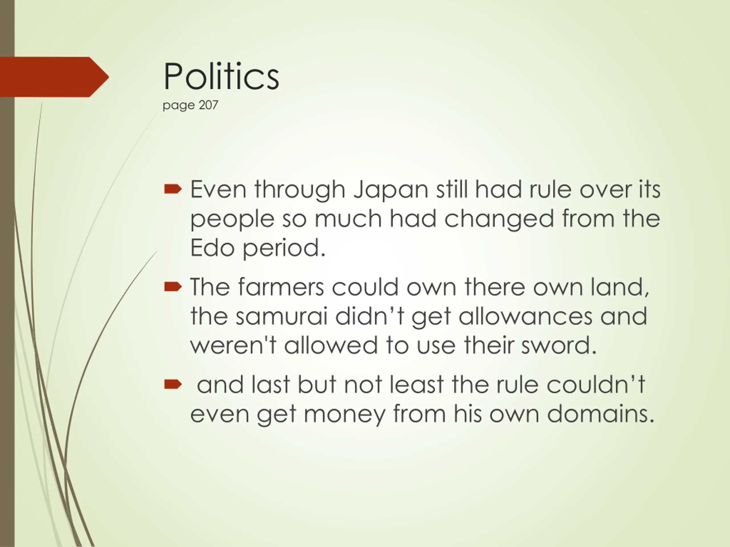 Politics page 207 Even through Japan still had rule over its people so much had changed from the Edo period. The farmers could own there own land, the samurai didn t get allowances and weren't allowed to use their sword. and last but not least the rule couldn t even get money from his own domains.