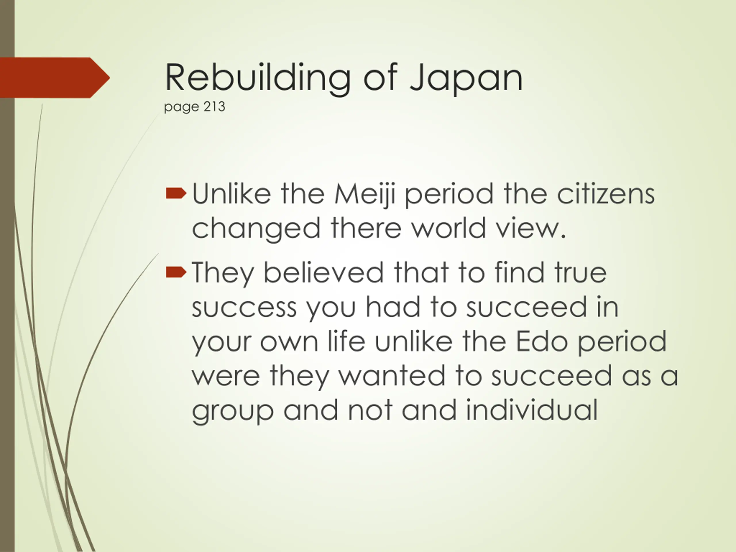 Rebuilding of Japan page 213 Unlike the Meiji period the citizens changed there world view. They believed that to find true success you had to succeed in your own life unlike the Edo period were they wanted to succeed as a group and not and individual