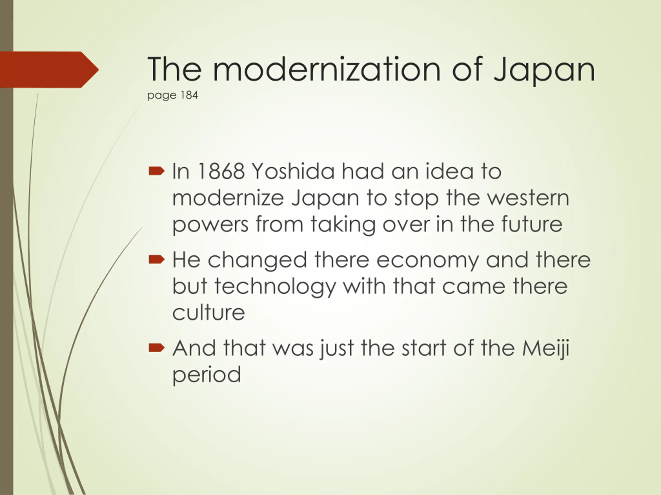 The modernization of Japan page 184 In 1868 Yoshida had an idea to modernize Japan to stop the western powers from taking over in the future He changed there economy and there but technology with that came there culture And that was just the start of the Meiji period