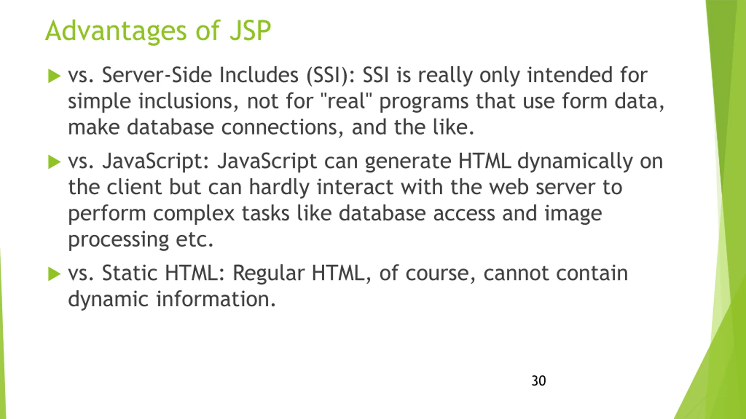 Advantages of JSP vs. Server-Side Includes (SSI): SSI is really only intended for simple inclusions, not for "real" programs that use form data, make database connections, and the like. vs. JavaScript: JavaScript can generate HTML dynamically on the client but can hardly interact with the web server to perform complex tasks like database access and image processing etc. vs. Static HTML: Regular HTML, of course, cannot contain dynamic information. 30
