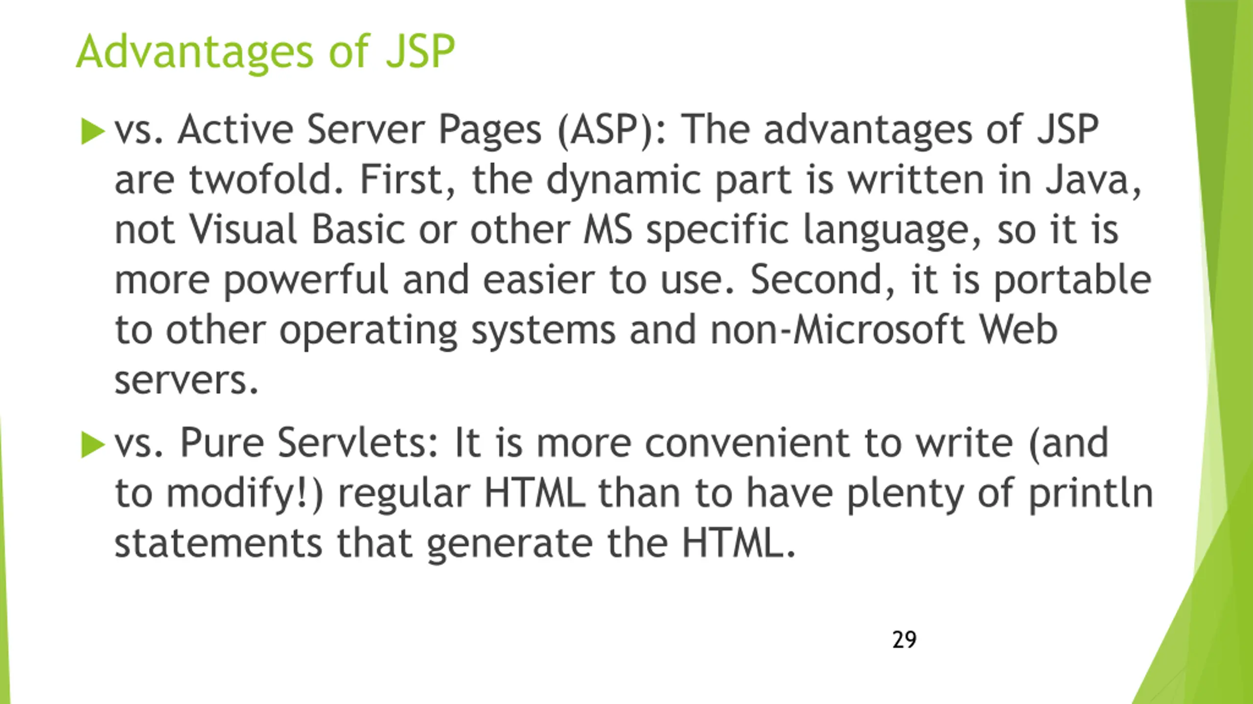 Advantages of JSP vs. Active Server Pages (ASP): The advantages of JSP are twofold. First, the dynamic part is written in Java, not Visual Basic or other MS specific language, so it is more powerful and easier to use. Second, it is portable to other operating systems and non-Microsoft Web servers. vs. Pure Servlets: It is more convenient to write (and to modify!) regular HTML than to have plenty of println statements that generate the HTML. 29