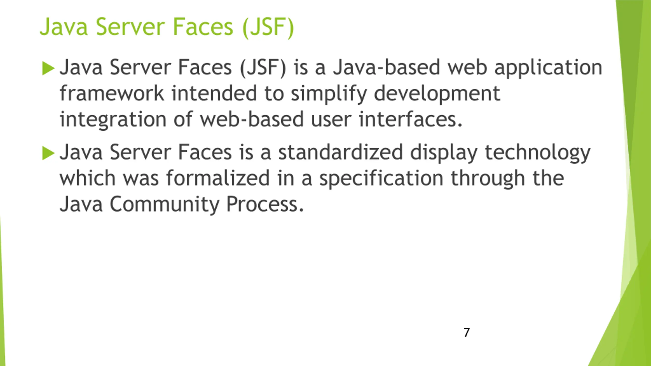 Java Server Faces (JSF) Java Server Faces (JSF) is a Java-based web application framework intended to simplify development integration of web-based user interfaces. Java Server Faces is a standardized display technology which was formalized in a specification through the Java Community Process. 7