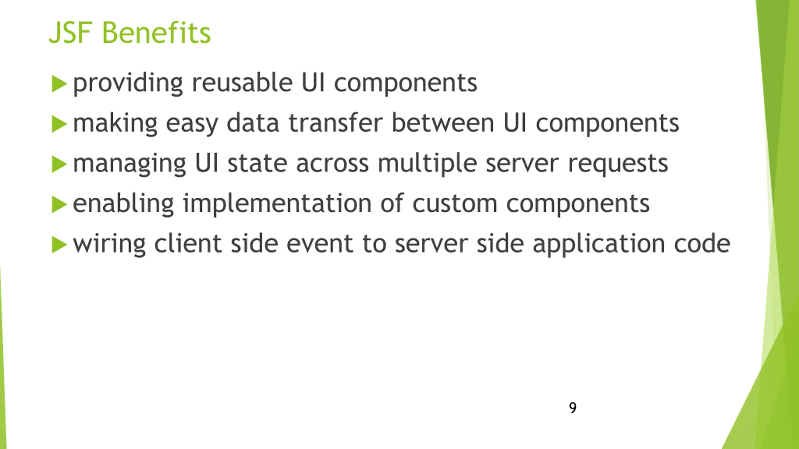 JSF Benefits providing reusable UI components making easy data transfer between UI components managing UI state across multiple server requests enabling implementation of custom components wiring client side event to server side application code 9
