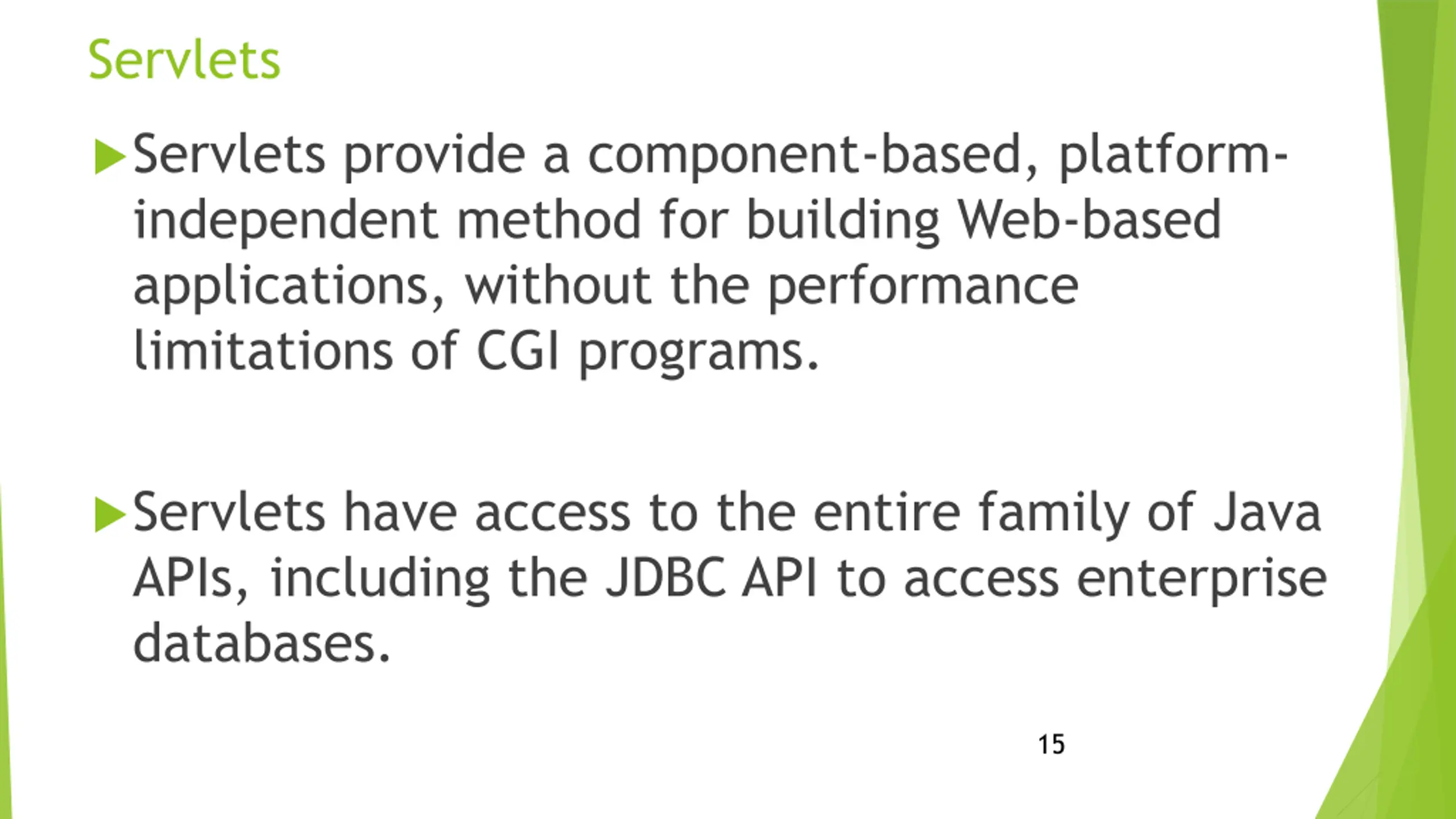 Servlets Servlets provide a component-based, platform- independent method for building Web-based applications, without the performance limitations of CGI programs. Servlets have access to the entire family of Java APIs, including the JDBC API to access enterprise databases. 15
