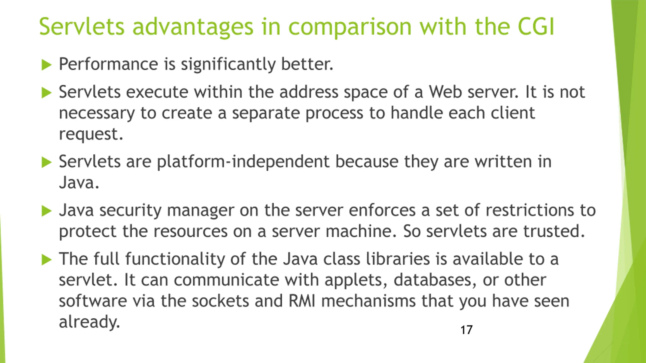 Servlets advantages in comparison with the CGI Performance is significantly better. Servlets execute within the address space of a Web server. It is not necessary to create a separate process to handle each client request. Servlets are platform-independent because they are written in Java. Java security manager on the server enforces a set of restrictions to protect the resources on a server machine. So servlets are trusted. The full functionality of the Java class libraries is available to a servlet. It can communicate with applets, databases, or other software via the sockets and RMI mechanisms that you have seen already. 17