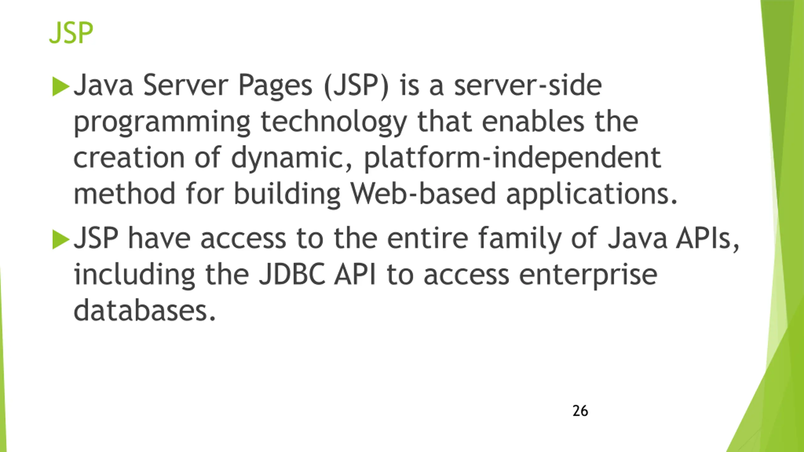 JSP Java Server Pages (JSP) is a server-side programming technology that enables the creation of dynamic, platform-independent method for building Web-based applications. JSP have access to the entire family of Java APIs, including the JDBC API to access enterprise databases. 26