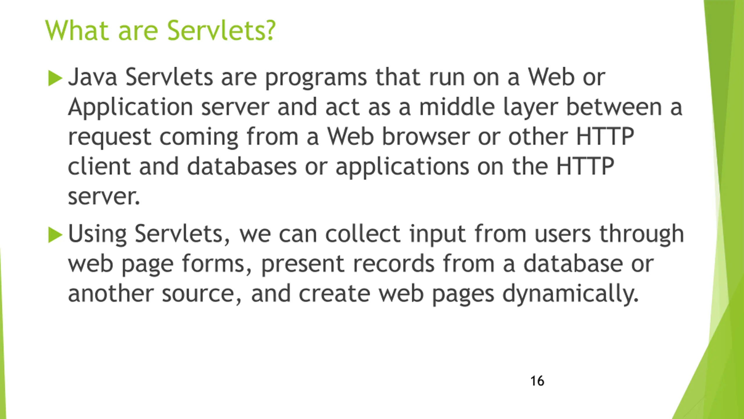 What are Servlets? Java Servlets are programs that run on a Web or Application server and act as a middle layer between a request coming from a Web browser or other HTTP client and databases or applications on the HTTP server. Using Servlets, we can collect input from users through web page forms, present records from a database or another source, and create web pages dynamically. 16
