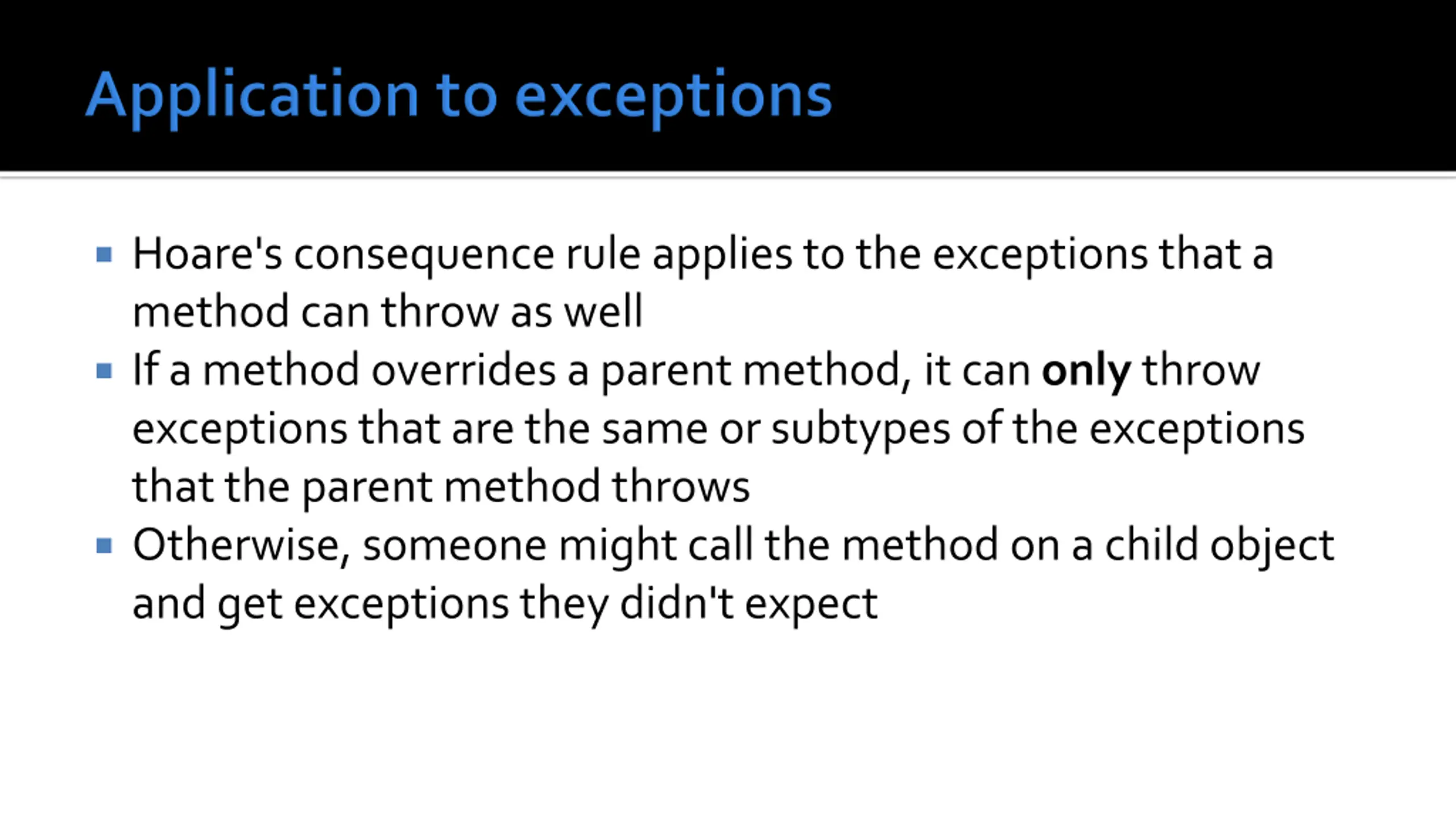 Hoare's consequence rule applies to the exceptions that a method can throw as well If a method overrides a parent method, it can only throw exceptions that are the same or subtypes of the exceptions that the parent method throws Otherwise, someone might call the method on a child object and get exceptions they didn't expect