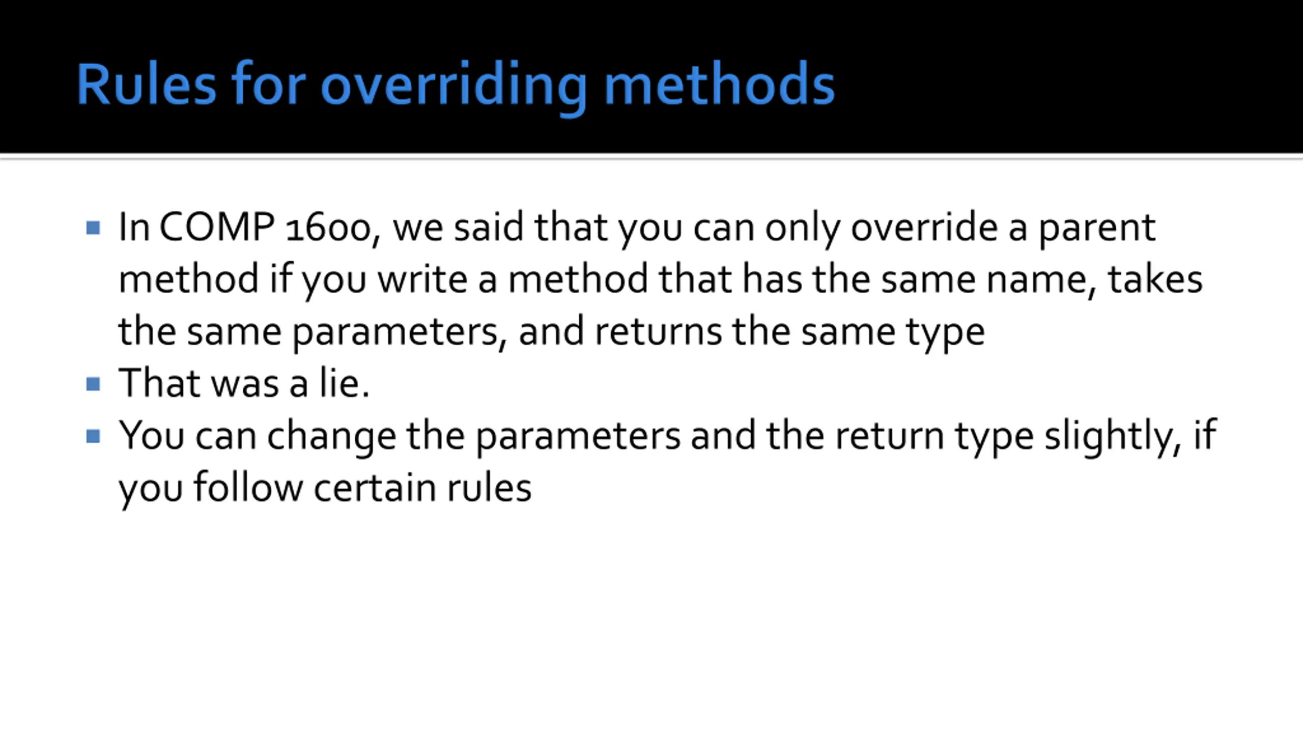 In COMP 1600, we said that you can only override a parent method if you write a method that has the same name, takes the same parameters, and returns the same type That was a lie. You can change the parameters and the return type slightly, if you follow certain rules