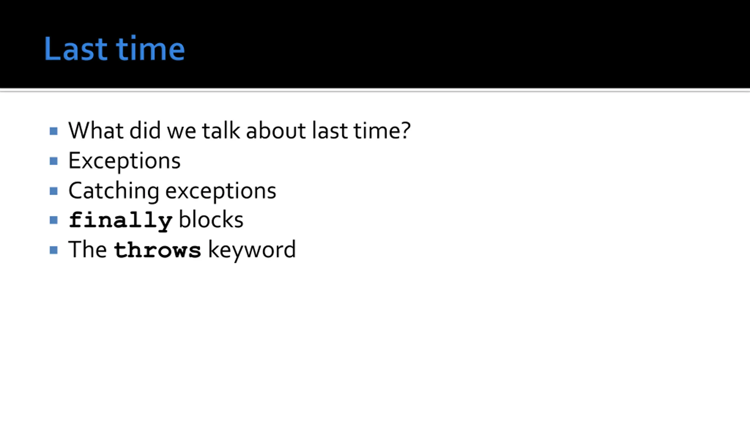 What did we talk about last time? Exceptions Catching exceptions finally blocks The throws keyword