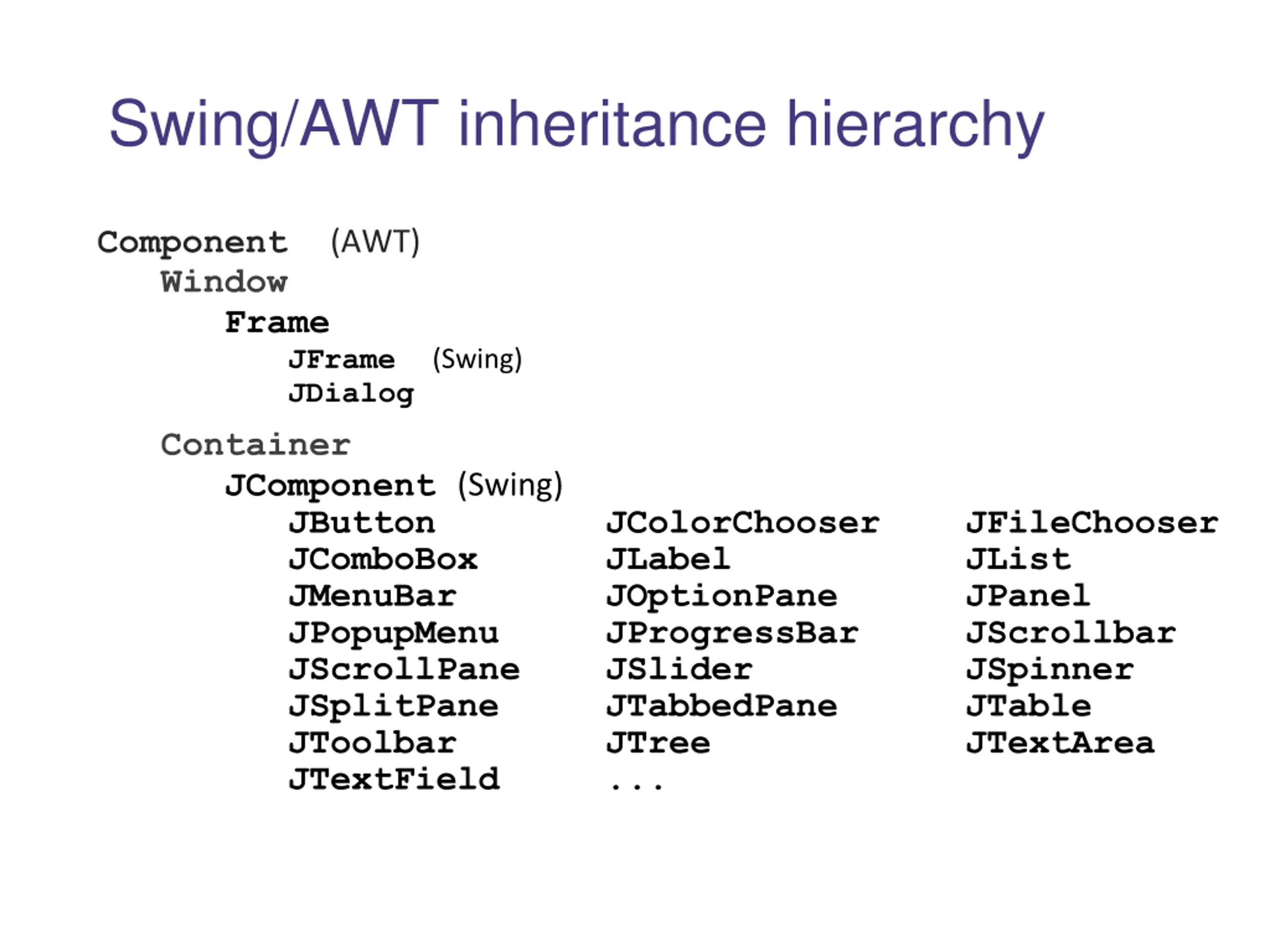 Swing/AWT inheritance hierarchy Component (AWT) Window Frame JFrame(Swing) JDialog Container JComponent(Swing) JButton JColorChooser JFileChooser JComboBox JLabel JList JMenuBar JOptionPane JPanel JPopupMenu JProgressBar JScrollbar JScrollPane JSlider JSpinner JSplitPane JTabbedPane JTable JToolbar JTree JTextArea JTextField ...