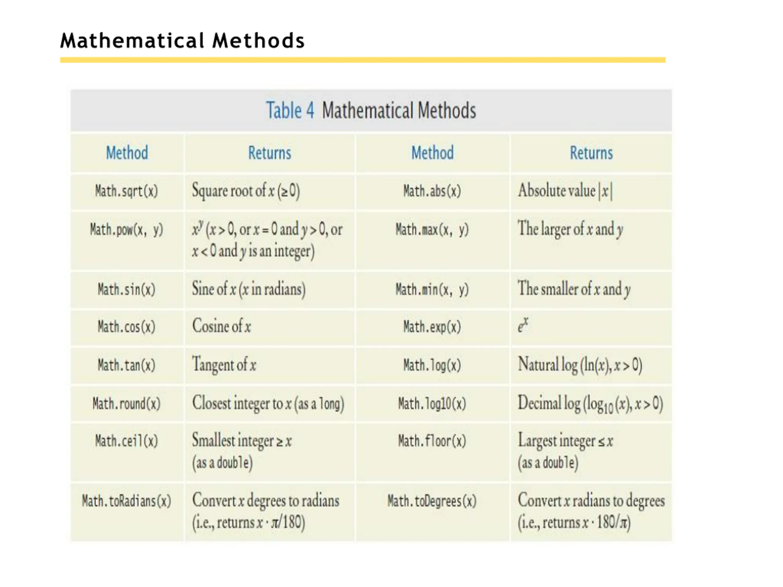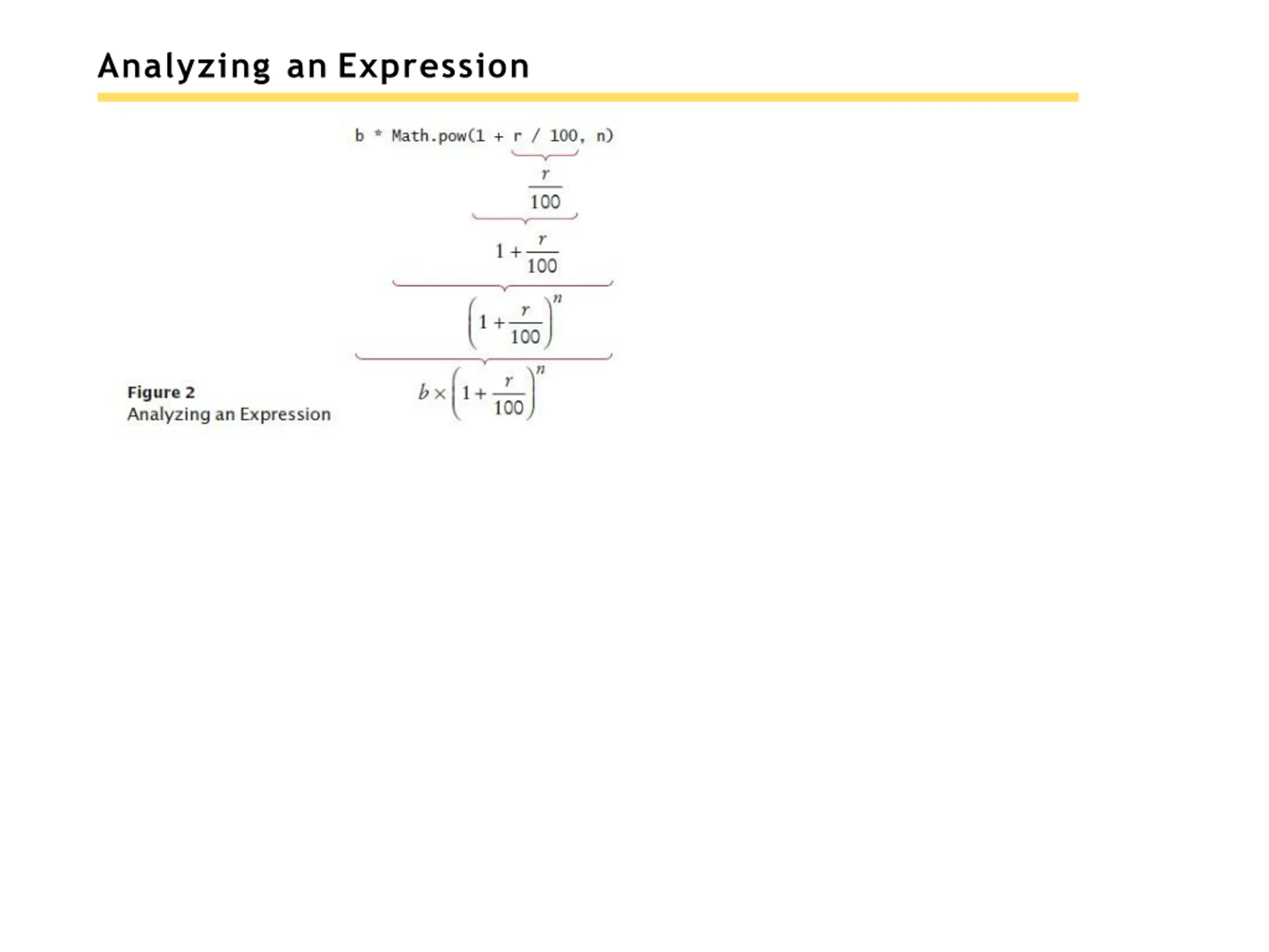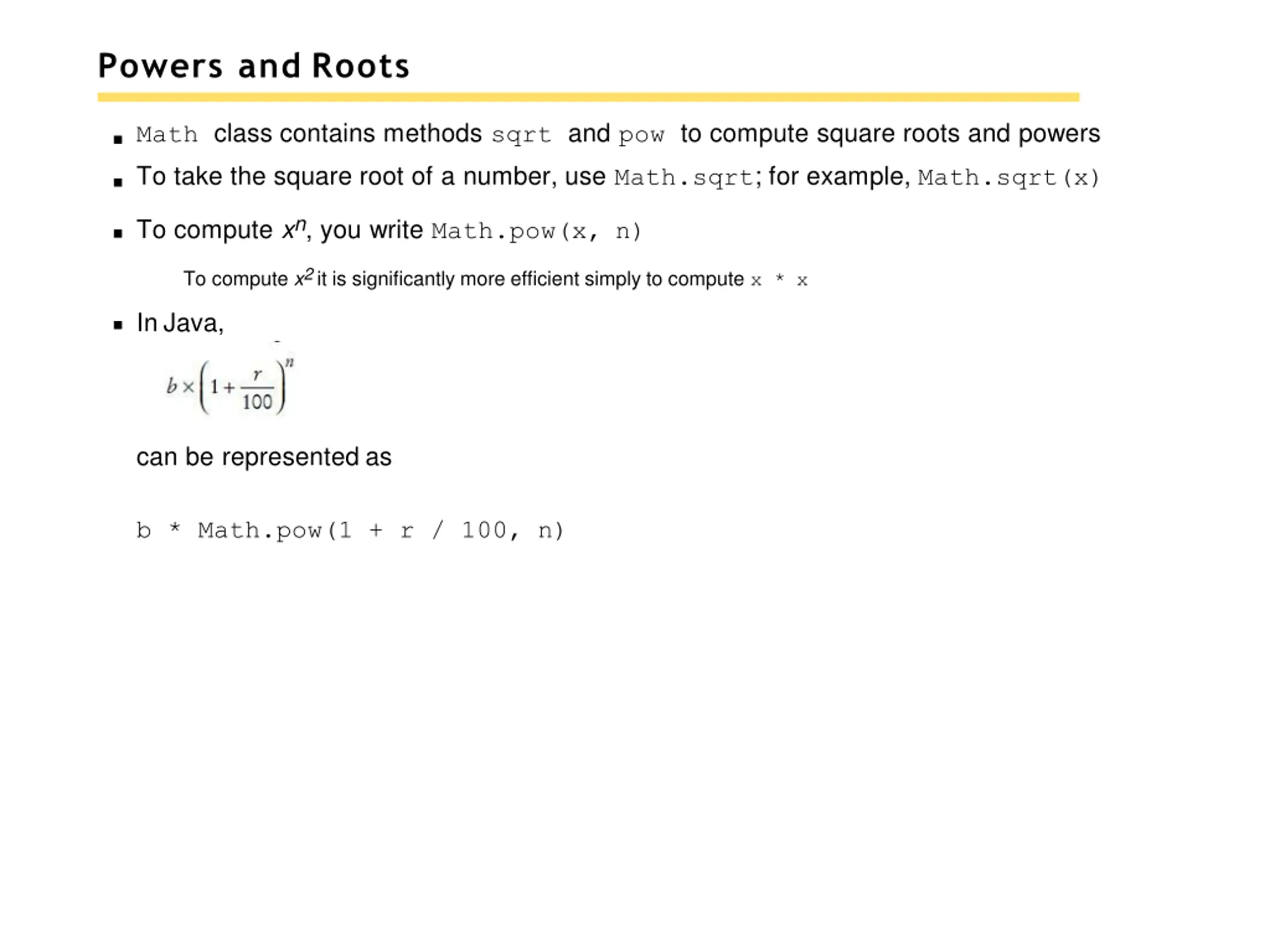 Powers and Roots Math class contains methods sqrt and pow to compute square roots and powers To take the square root of a number, use Math.sqrt; for example, Math.sqrt(x) To compute xn, you write Math.pow(x, n) To compute x2 it is significantly more efficient simply to compute x * x In Java, can be represented as b * Math.pow(1 + r / 100, n)