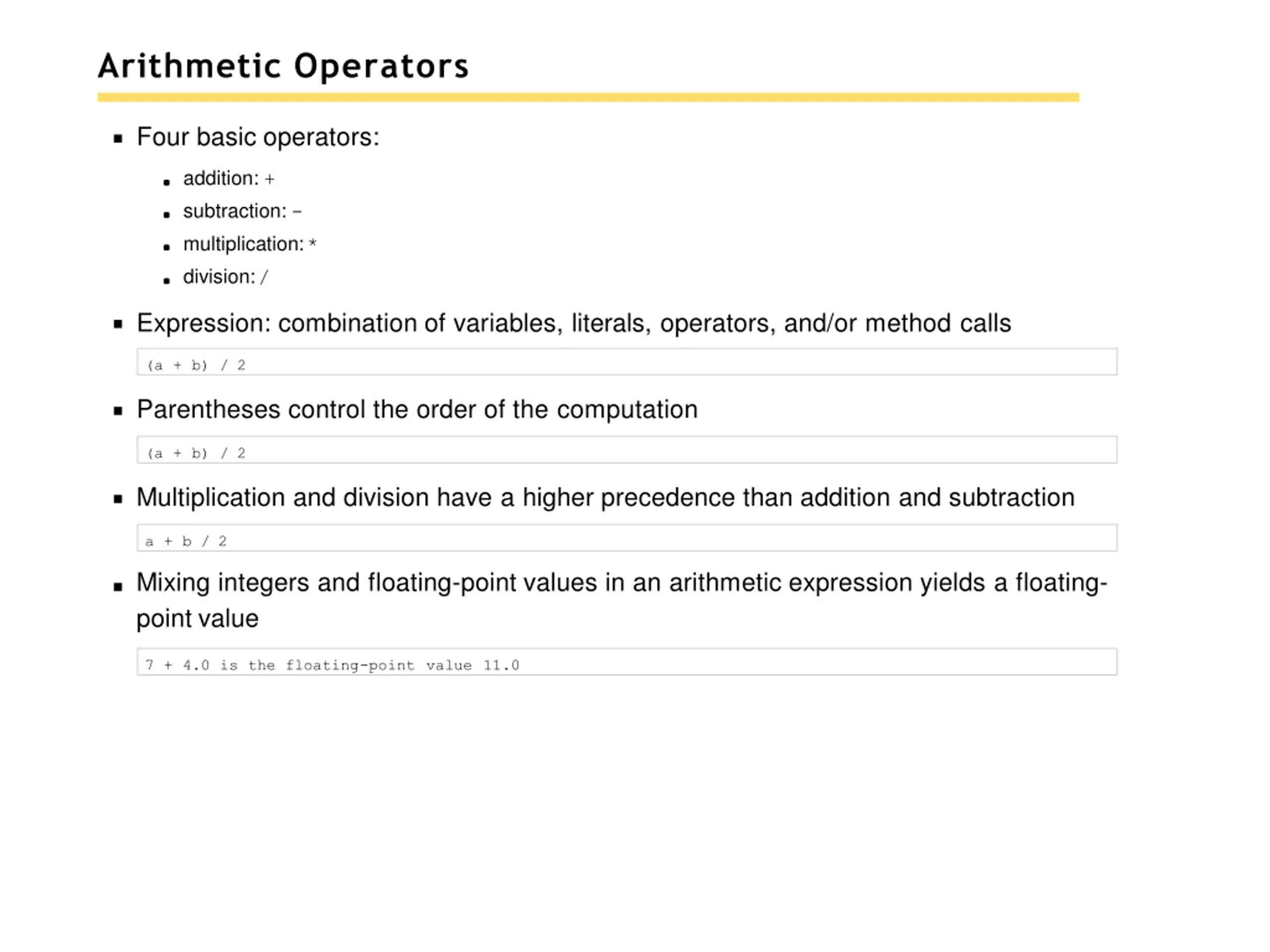 Arithmetic Operators Four basic operators: addition: + subtraction: - multiplication:* division:/ Expression: combination of variables, literals, operators, and/or method calls (a + b) / 2 Parentheses control the order of the computation (a + b) / 2 Multiplication and division have a higher precedence than addition and subtraction a + b / 2 Mixing integers and floating-point values in an arithmetic expression yields a floating- point value 7 + 4.0 is the floating-point value 11.0
