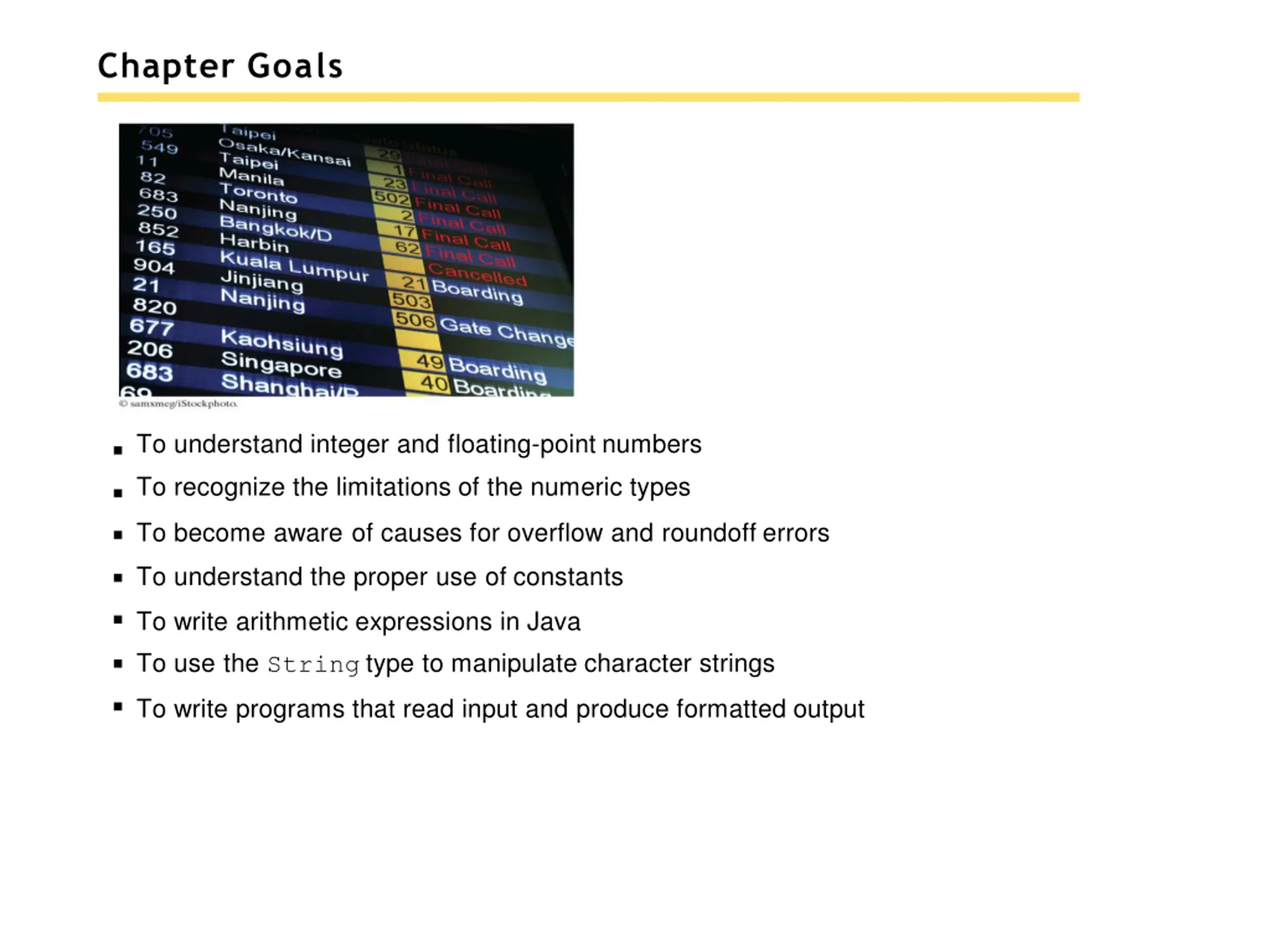 Chapter Goals To understand integer and floating-point numbers To recognize the limitations of the numeric types To become aware of causes for overflow and roundoff errors To understand the proper use of constants To write arithmetic expressions in Java To use the String type to manipulate character strings To write programs that read input and produce formatted output