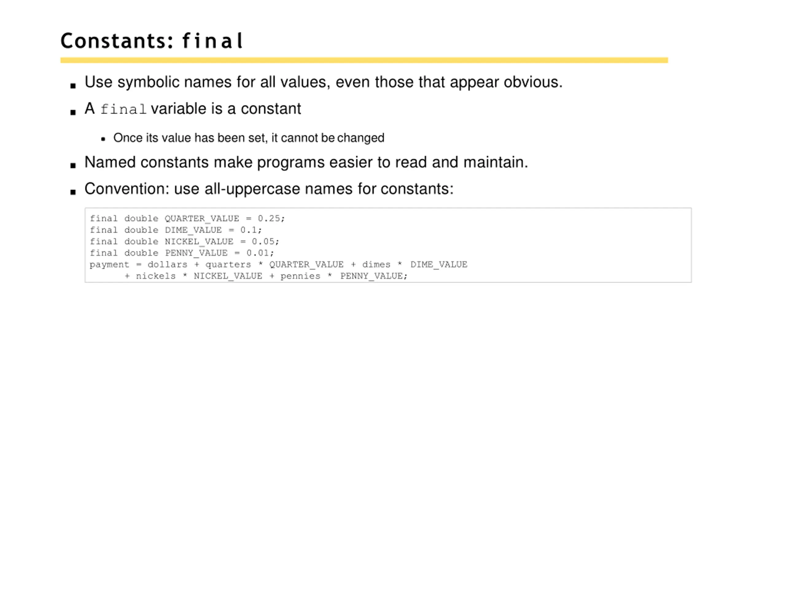 Constants: final Use symbolic names for all values, even those that appear obvious. A final variable is a constant Once its value has been set, it cannot bechanged Named constants make programs easier to read and maintain. Convention: use all-uppercase names for constants: final double QUARTER_VALUE = 0.25; final double DIME_VALUE = 0.1; final double NICKEL_VALUE = 0.05; final double PENNY_VALUE = 0.01; payment = dollars + quarters * QUARTER_VALUE + dimes * DIME_VALUE + nickels * NICKEL_VALUE + pennies * PENNY_VALUE;