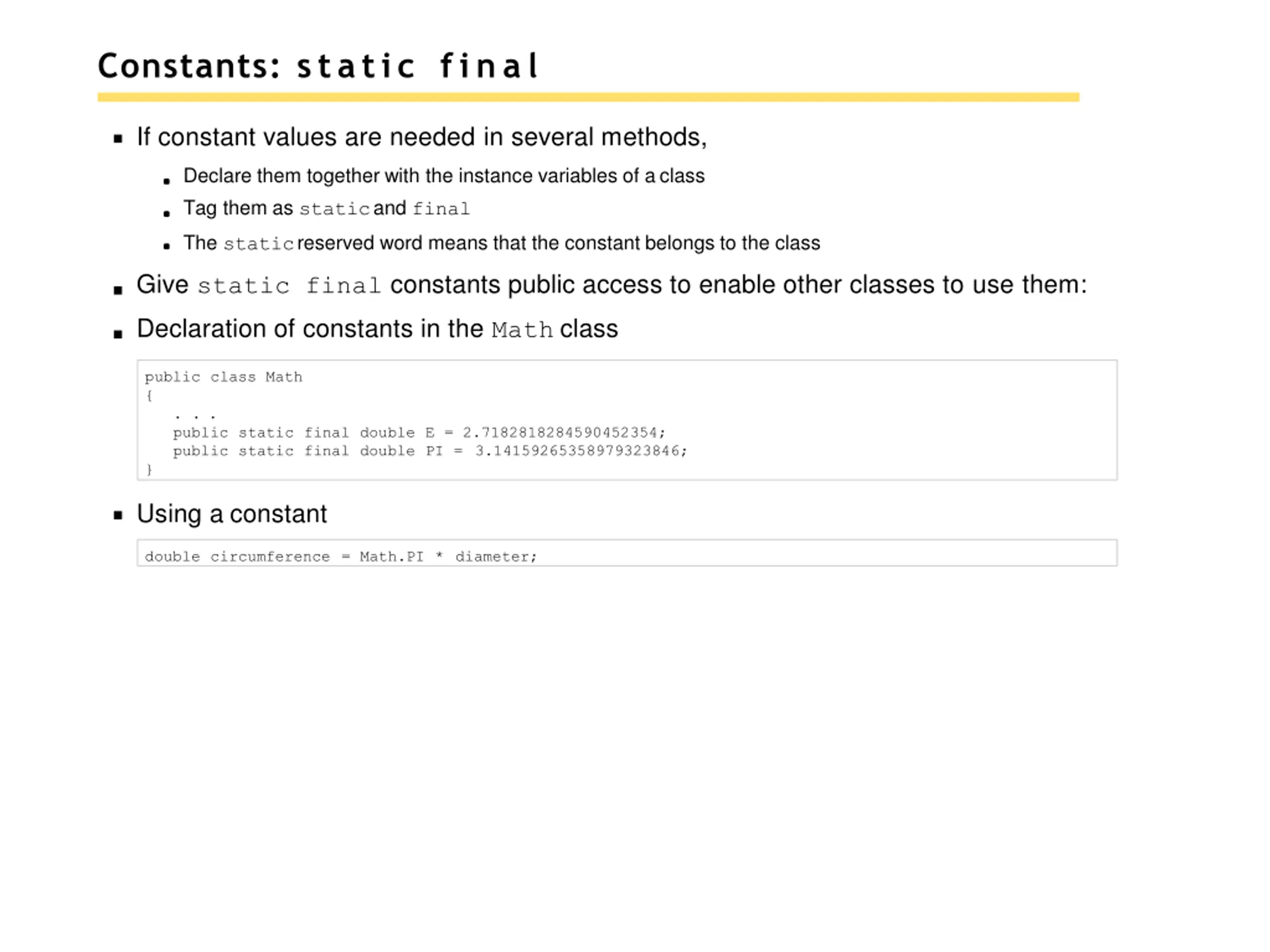 Constants: static final If constant values are needed in several methods, Declare them together with the instance variables of aclass Tag them as staticand final The staticreserved word means that the constant belongs to the class Give static final constants public access to enable other classes to use them: Declaration of constants in the Math class public class Math { . . . public static final double E = 2.7182818284590452354; public static final double PI = 3.14159265358979323846; } Using a constant double circumference = Math.PI * diameter;