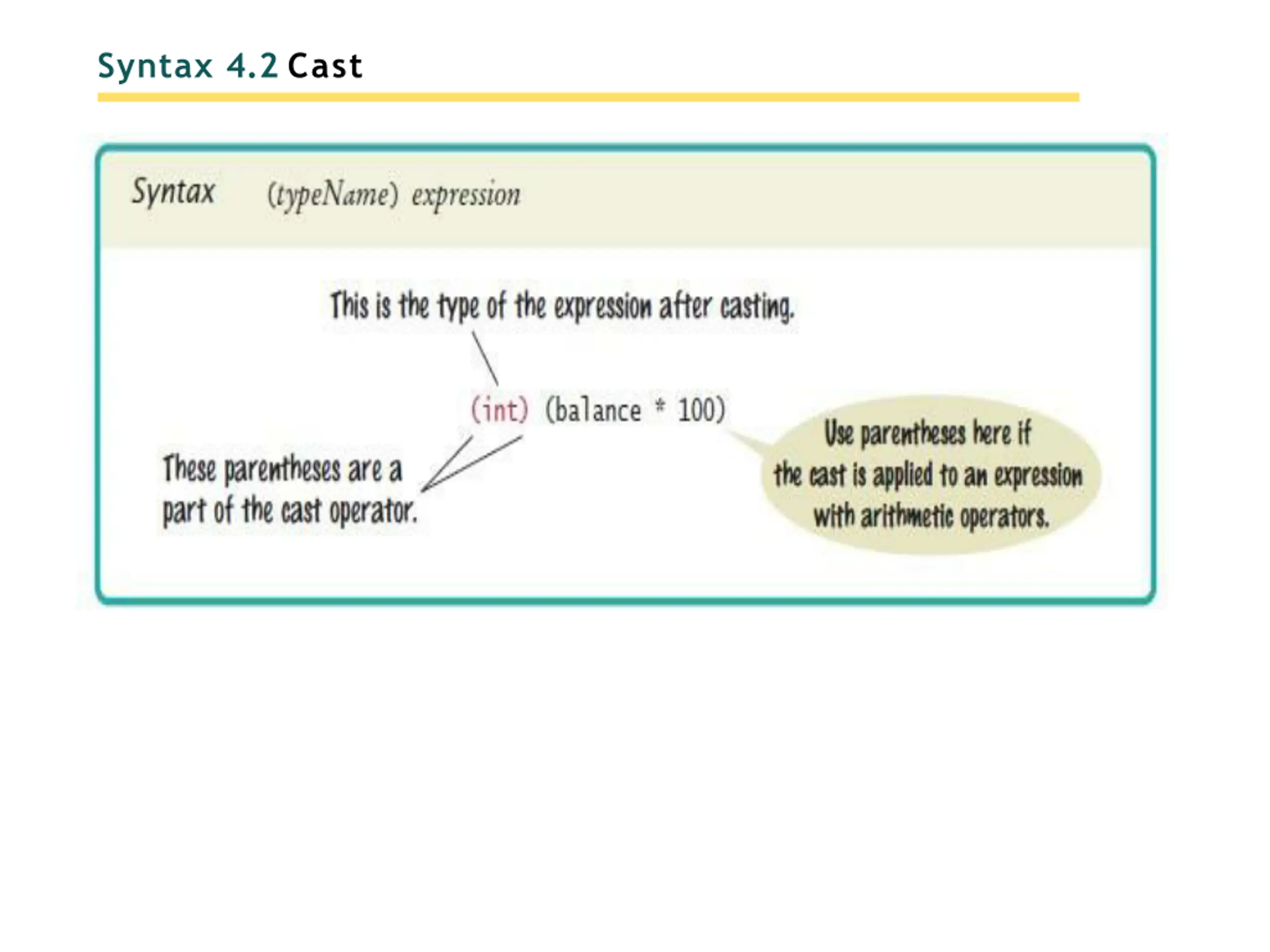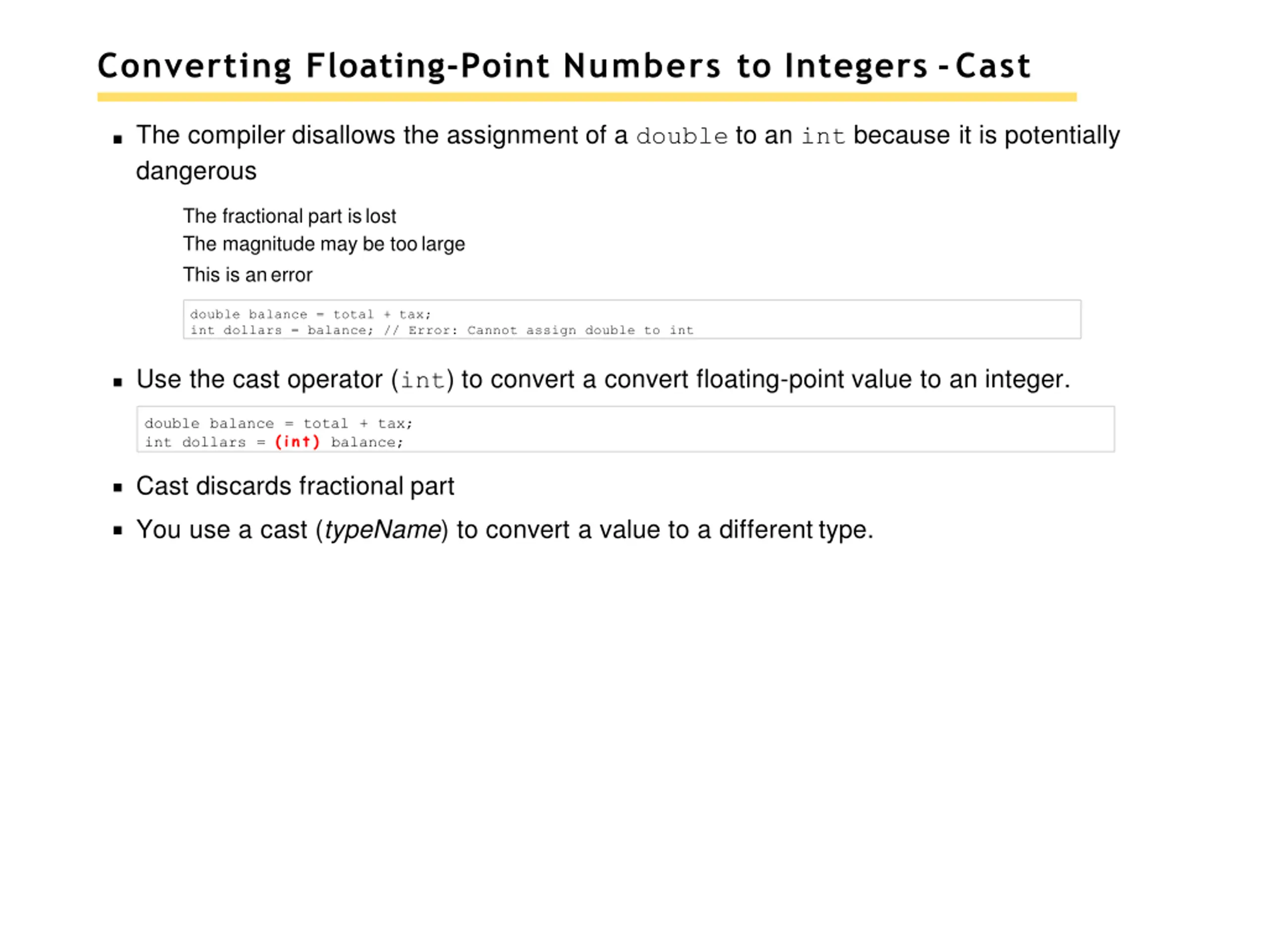 Converting Floating-Point Numbers to Integers -Cast The compiler disallows the assignment of a double to an int because it is potentially dangerous The fractional part islost The magnitude may be toolarge This is anerror double balance = total + tax; int dollars = balance; // Error: Cannot assign double to int Use the cast operator (int) to convert a convert floating-point value to an integer. double balance = total + tax; int dollars = ( i nt) balance; Cast discards fractional part You use a cast (typeName) to convert a value to a different type.