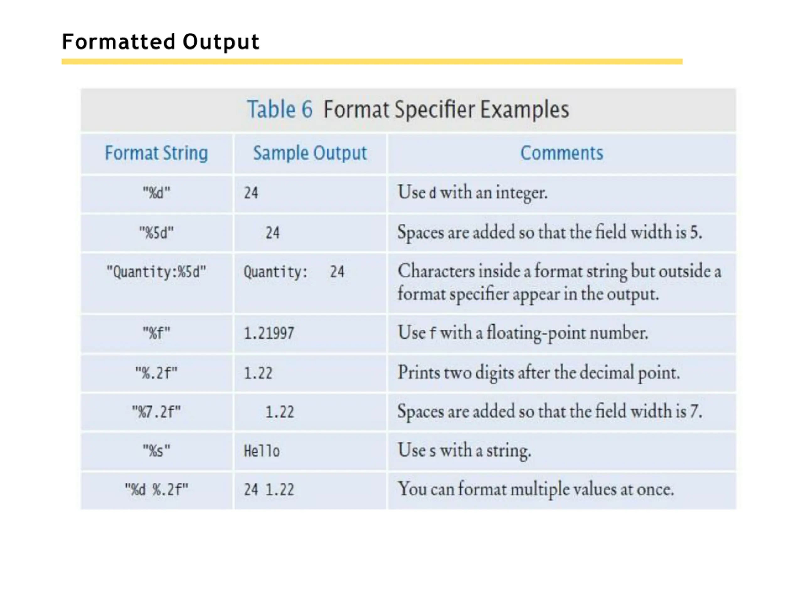 Formatted Output You can also specify a field width: System.out.printf("%10.2f", price); This prints 10 characters Six spaces followed by the four characters1.22 This command System.out.printf("Price per liter:%10.2f", price); Prints Price per liter: 1.22